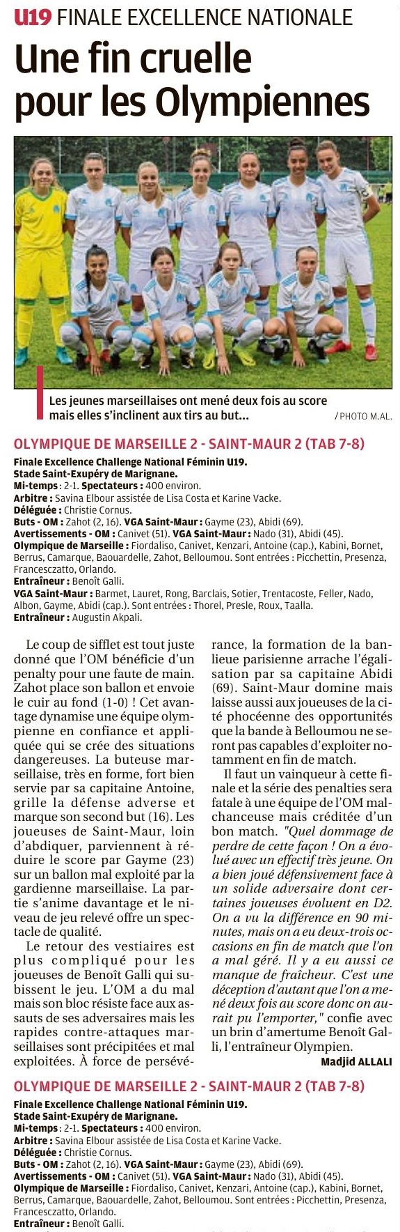 Rencontres championnat Excellence groupe C Asptt Albi 0-1 OM <> Toulouse 2-4 OM <> OM 4-1 Nice <> Rodez 2-4 OM OM 2-1 Nimes <> OM 1-2 Toulouse <> Nice 0-4 OM <> OM 7-0 Rodez Nimes 0-2 OM <> OM 9-0 Asptt Albi Classement : 1er : 27pts - 9V - 0N - 1D - 38Bp - 8Bc ------------------------------------------ 1/2 finale championnat Excellence OM 4-0 Reims Finale championnat Excellence OM 2-2 (6 tab 7) V.G.A Saint Maur ------------------------------------------ |