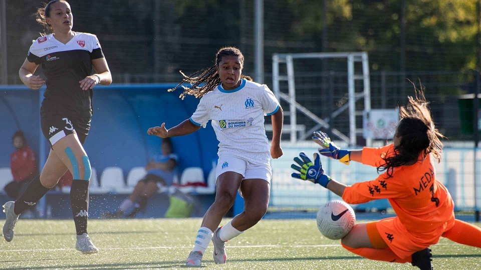 Saison 2021/2022 Il y a très peu de changement, Maud Antoine et Sarah Zahot, quittent l'OM, Clark Ashley et l'ancienne olympienne Anais M'Bassidje viendront renforcer l'attaque. L'OM débutera ce nouveau championnat par un nul (0-0) sur la pelouse de Merignac, les Phocéennes joueront à 10 durant une heure. Alors que les Olympiennes menaient à deux reprises, elles s'inclineront, sur leur terrain, 3-2 face à Nice. A Grenoble, les Marseillaises débloqueront leur compteur de succès par la plus petite des marges (0-1), Elles chuteront de nouveau à la maison face à Rodez (1-2). Grâce à sa victoire sur Le Puy (0-3), l'OM remontera à la 5ème place à trois points du leader, Ashley Clark, capitaine de notre équipe, s'offrira un doublé. Nouvelle victoire sur Albi (2-0), la première à domicile, Malgré l'ouverture du score d'Ashley Clark à la 34e minute de jeu, les joueuses de Christophe Parra seront battues à Yzeure sur le score de 2-1, nos Marseillaises encaisseront deux buts dans les 20 dernières minutes. Même scénario face à Thonon, Ashley Clark signera l'ouverture du score en première mi-temps, mais dans les dernières minutes, elles concéderont le nul (1-1). Le 24 novembre, pour le 1er tour de la Coupe de France, l'histoire se répètera. Alors qu'elles menaient 3-1 à moins de dix minutes de la fin du temps réglementaire, elles se firent rejoindre (3-3), puis éliminées lors de la séance des tirs au but face au Puy. Les matches suivants, elles seront défaites par le mal classé Nîmes (1-0), étrillées à Nice (4-1) et humiliées sur le campus de l'OM (1-3) par Montauban. Le 04 février, suite à ces mauvais résultats, Christophe Parra sera remercié, il sera remplacé par Franck Borrelli. Menées deux fois, les joueuses marseillaises reviendront au score pour arracher le point du match nul à domicile face à Grenoble (2-2). Malgré un doublé Ashley Clark, l'OM sera de nouveau battu en fin de rencontre par le leader Rodez (3-2). Encore un doublé de sa capitaine et nouvelle défaite à domicile face à Le Puy (2-3). L'équipe féminine, pourtant réduite à 10 après 30 minutes de jeu, signera un succès (0-3) primordial dans la course au maintien sur la pelouse d'Albi, Courte défaite face à Yzeure (0-1). Cette fois le signe indien sera brisé, menées après 21 minutes de jeu, les joueuses de Frank Borrelli renverseront la vapeur en seconde période et s'imposeront à Thonon (2-1). Avec la victoire sur Nîmes (4-1), l'OM validera son maintien en D2 féminine. Elles finiront par deux nouvelles victoires face à Montauban (2-3) et Merignac (7-0), terminant la saison à la septième place.