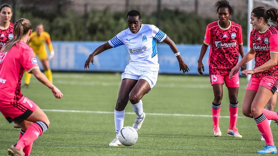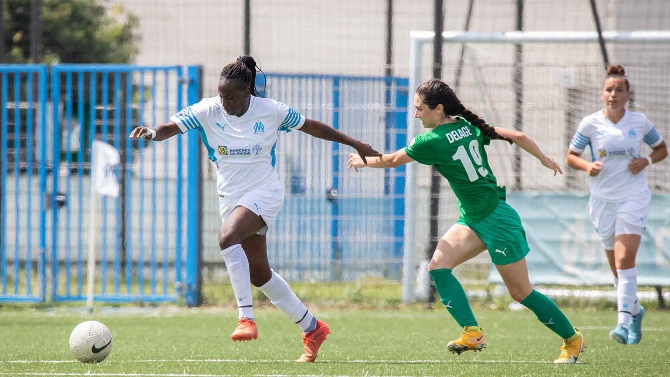 Saison 2022/2023 L'OM effectue un grand changement 11 joueuses rejoignent le club, tandis que 14 olympiennes le quitteront. L'objectif du nouvel entraîneur Guesmia est de revenir au sommet afin d'effacer le désastre de l'année dernière. Malgré le fait de jouer à dix, une très grand partie, suite à l'expulsion de Conesa en première mi-temps, les coéquipières de Ashley Clark s'imposeront deux à zéro pour le premier match. Elles seront sans pitiés face à Nîmes (0-8), avec un triplé de Mama Diop en deuxième période. Les Marseillaises soutiendront le rythme des stéphanoises, victoires sur Yzeure (4-0), Le Puy (0-1), Montauban (3-0), Alès (0-2), Nice (2-0). Le première faux pas se situera à la 8ème journée face à Grenoble, elles ramèneront quand même le match nul (0-0), mais lasseront les 2 premiers points au leader. Avant le choc de la 11ème journée face à l'ASSE, l'OM s'imposera face à Toulouse (2-0) et à Thonon (1-2). Pour l'affiche de la 11ème journée, les joueuses de Yacine Guesmia grâce, à Ashley Clark et Ndeye Awa Diakhaté mèneront 2-0 à la demi-heure de jeu. Mais juste avant le repos, les Verts réduiront l'écart par l'ancienne marseillaise, Cindy Caputo. La fin de la seconde période sera très mouvementée, l'égalisation sera entachée d'une main, dans la foulée Mbayang Sow sera expulsée pour avoir poussée l'arbitre. Les Olympiennes ne seront plus dans la partie, elles concéderont un troisième but et se retrouveront à 5 points du leader, toujours invaincu. L'OM enchaînera les victoires, Nîmes (10-0), Yzeure (0-1), Le Puy (3-2), Montauban (0-3), Albi (6-0) et reviendra à 3 points de Saint Etienne. Lors du derby de la Côte d'Azur, les Niçoises surprendront dès les premières minutes les Marseillaises, malgré leurs efforts pour égaliser, elles encaisseront un second but à l'heure de jeu (2-0). La défaite à domicile face à Grenoble, scellera la fin de l'espoir de montée en D1. Match de folie à Toulouse ou l'OM, au bout d'une demi-heure de jeu, mènera trois à zéro, l'expulsion de Demebele, à la 50' minute, permettra aux Violettes d'accrocher dans les dernières secondes le match nul (4-4). Nouvelle rencontre sans succès face à Evian (2-2), les Marseillaises dominées en première période redresseront la barre en deuxième mi-temps pour arracher le nul en fin de match. Au classement, l'OM n'avance plus (2e) et voit la montée définitivement s'envoler. Après cette série de quatre matchs sans succès, les Olympiennes battent le leader Saint-Etienne (1-0), sous un ciel gris et devant un public venu en nombre pour assister au dernier match à domicile de la saison, elles l'emporteront (1-0), les Provençales marquèrent, contre le cours du jeu, grâce à leur meilleure buteuse Mama Diop. Cette victoire n'aura aucune incidence sur le classement, puisque les Foréziennes seront assurées de monter en D1 l'année prochaine. Le dernier match, face à Clermont, verra le retour à la compétition de l'attaquante américaine, Ashley Clark, absente depuis plusieurs mois après sa blessure à la cheville. Mama Diop réalisera un doublé et les joueuses de Yacine Guesmia termineront donc la saison par un succès (0-2) et conforteront leur deuxième place au classement. En Coupe de France pour le 1er tour Fédéral, Chadrac Brives tiendra un quart d'heure avant que le rouleau compresseur marseillais se mette en route, victoire 0-11. Pour le dernier match de l'année 2022, les Olympiennes écraseront l'ASPTT Montpellier (0-9), lors du deuxième tour fédéral de Coupe de France. Après une première période compliquée, les Marseillaises prendront le match en main au retour des vestiaires. Face au TFC, avant-dernier du groupe B de division 2 féminine, les joueuses de Yacine Guesmia feront la différence en seconde période, faisant respecter la hiérarchie (0-4). En huitième de finale, c'est Guingamp, pensionnaire de la 1ère division qui leur sera opposé, les Olympiennes prendront le match par le bon bout en marquant deux buts en première période, mais les Bretonnes réagiront et c'est la séance des tirs aux buts qui départageront les deux équipes. Pour la première fois de son histoire, les Phocéennes joueront un quart de finale de Coupe de France. Thonon-Evian qui évolue dans le même groupe, sera le prochain adversaire. La partie sera très disputée et c'est de nouveau les tirs aux buts qui devra décider de l'issue de la rencontre. Les Haut Savoyardes seront plus efficaces dans cet exercice en réussissant toutes leurs tentatives alors que, côté olympien, Coumba Dembélé verra son tir repoussé par la gardienne adverse mettant ainsi fin à l'aventure.