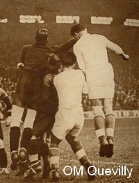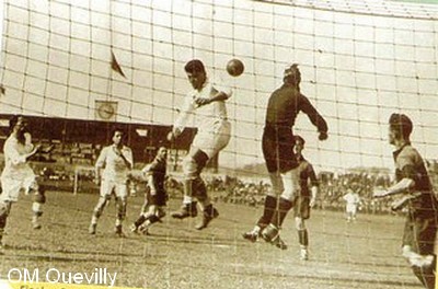Pendant les premières minutes, Quevilly déploya sa méthode habituelle de jeu ardent, omniprésent, constamment transformé, rectifié, amélioré. L'Olympique de Marseille, surpris par les coups de boutoir incessants de son adversaire, fut quelque peu désorienté et dominé. Il ne perdit pas pied, mais il tarda à se mettre en action positive, à prendre la mesure de son rival et à commencer l'édification de son football constructif. Si Quevilly, par l'intermédiaire de son aile gauche Déans-Guillard, faillit d'un rien marquer deux fois des buts sur coup de tête, il méritait amplement un tel avantage, et la réussite de pareils essais auraint maintenu le match à un niveau qu'il n'atteignit plus par la suite. |