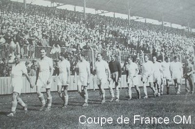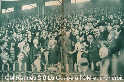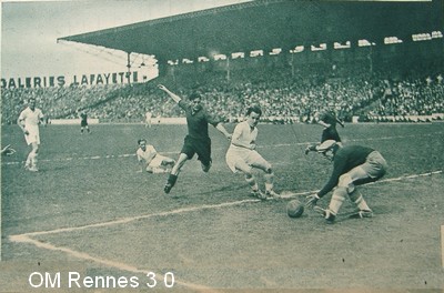 Première période : trac, on nous avait décrit l'engagement des Marseillais comme devant être foudroyant. Il fut rampant et incertain. Alcazar commença par donner des coups de pied dans le vide, par "déchirer quelques belles toiles" suivant l'expression populaire sportive ; Charbit n'avait rien d'un demi international ; Zermani était timide comme un débutant ... Toute l'équipe était neutralisée par l'importance de l'enjeu, la crainte de mal faire et l'obsession de la défaite. C'est que l'O.M. avait plus de responsabilités que Rennes ; ses joueurs de dimanche étaient porteurs d'un nom glorieux et héritiers d'une longue et belle tradition qui a conduit leurs prédécesseurs à trois succès, en 1924 en 1926 et 1927 et à une finale perdue, l'an dernier, sur Sète, 2 buts à 1. Heureusement pour les Méridionnaux, les Bretons peinèrent, eux aussi, à se mettre en train, tant ils étaient nerveux et impatients. |