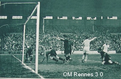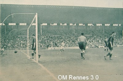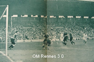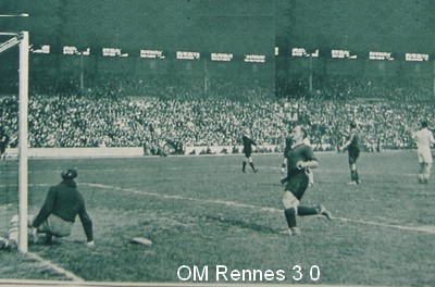 Deuxième période : après 25 minutes de tâtonnement, l'O.M. trouva la cadence. Les passes trouvèrent leur destinataire ; Eisenhoffer déclencha de beaux mouvements stratégiques ; Kohut quoiqu'il donne l'impression d'épaissir, réussit de superbes dribbles le long de la ligne et des centres prometteurs. Il n'est pas jusqu'à Alcazar lui-même qui ne contribua au jeu organisé et combiné. Durant cete période, qui s'étendit jusqu'à la mi-temps, les Marseillais furent les maîtres du terrain. Leur flagrante supériorité ne revêtait pas seulement un caractère démonstratif ; elle mettait la défense rennaise en péril, et le gardien breton Collet eut vite fait de donner des signes non équivoques d'affolement. |