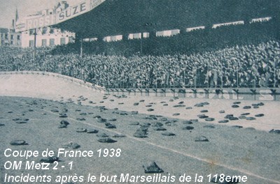 L'ambiance de la finale de la Coupe de France 1938 fut très chaude, en dépit d'un vent du Nord qui avantagea tour à tour chaque équipe. Il est dommage qu'une finale aussi remarquable, la plus brillante des finales de Coupe de France auxquelles nous ayons assisté depuis plusieurs années se soit terminée par un incident. Dimanche soir, tout le monde, joueurs, et spectateurs, avait tendance à oublier la qualité du jeu, l'ardeur de l'action, le marquage de Metz contrebalançant la souplesse et l'esprit d'initiative de Marseille, l'équilibre des forces en présence et l'intérêt constant de la rencontre, pour ne plus s'inquiéter que de la question de savoir si le second but, marqué pour Marseille par Aznar était acquis ou non. |