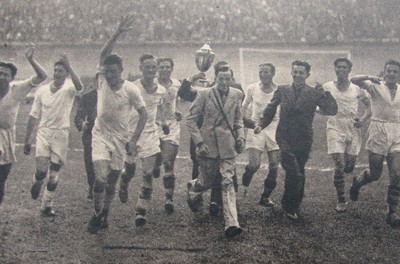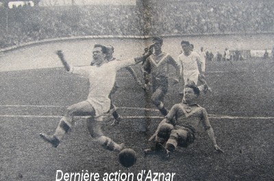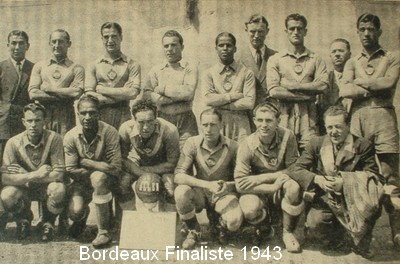 La Coupe Charles Simon 1943 n'ira cependant ni à Lens, ni à Toulouse. L'OM s'est qualifié en battant Perpignan en demi-finale 3 à 0 au Stade Vélodrome. Les Marseillais sont opposés aux Girondins de Bordeaux qui ont éliminé Lens dans leur zone. L'équipe artésienne a perdu devant les Girondins (1-2) sa chance de jouer la finale toutes zones devant l'O.M. Le 9 Mai au Parc, Bordelais et Marseillais ne peuvent se départager (2-2). Au centre de la défense girondine, l'anguleux Francisco Matéo, rescapé quelques mois plus tôt d'un grave accident de la route, a réussi à contenir le fougueux Aznar et ses jeunes coéquipiers. Georges Dard, Scotti, Robin et Pironti. |