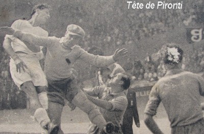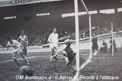 A la 8e minute, Pironti se démet la clavicule au cours d'une collision au sol avec Gérard qui, plonge sur le ballon : il sort un moment du terrain et voilà les dirigeants marseillais consternés. Toutefois, la domination de l'O.M. n'est pas pour autant compromise : à la 15e minute, une faute de mains commise, instinctivement sans doute, mais volontairement aussi, dans la surface de réparation, par Normand qui n'a pas réussi jusqu'ici à remplacer définitivement ses habitudes de joueur de rugby par les réflexes du footballeur. L'arbitre M. Sdez n'accorde pas le penalty, Robin s'étant emparé du ballon pour ne rater le but que d'un rien. Si l'unique point de la première mi-temps est obtenu par Aznar à la 32e minute seulement, c'est que l'heure n'a pas sonné où la défaite girondine tournerait en déroute et presque en débâcle |