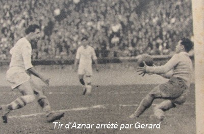A la 3e minute Normand laisse rebondir et filer vers le but un ballon qu'il aurait pu reprendre, mais qu'il préfère confier à la vigilance et à l'arrêt de son gardien. Mais Gérard se tient comme pétrifié sur sa ligne de but et le point serait acquis sans mal ni lutte par les Marseillais si le ballon ne heurtait le montant droit, qui le repousse ! |