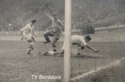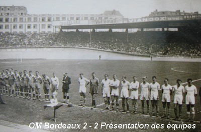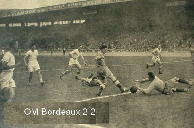 Les signes avant-coureurs de la victoire phocéenne se mulltiplient cependant, en même temps que le spectre de l'échec bordelais apparait en surimpression dans l'atmosphère passionnée du stade. Si les Marseillais avaient mené à la mi-temps par 4-0 nul n'aurait crié au scandale. Qu'ils gagnent finalement par cette marque de 1-0 est à peine équitable : une différence de six ou huit buts serait aussi justifiée. Il faut bien qu'ici nous donnions l'explication du résultat, le plus lourd enregistré depuis qu'existe la Coupe de France. Le motif tient en quelques mots : il n'y eut, samedi, au Parc des Princes, qu'une équipe sur le terrain. |