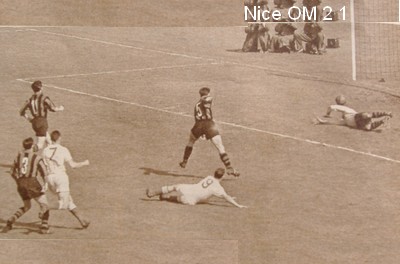 Ils attaquèrent franchement dès le coup d'envoi, et comme un boxeur cueilli à froid, le onze marseillais encaissa deux coups dont il ne se remit jamais. Ce furent les deux buts marqués par Nice (5 et 10 minutes) le premier par Nuremberg, le second par Carniglia. Nous ne dirons pas avec la complicité du portier marseillais Angel, cela serait injuste mais nous n'hésitons pas à dire qu'avant le coup de tête de Nuremberg, Angel devait sortir pour intercepter le centre donné par Ujlaki et empêcher la reprise et que sur le shot de Carniglia il eut une hésitation qui lui fut fatale. Deux buts d'avance en finale de Coupe c'est un handicap mortel. Et l'on pensait que les Niçois allaient augmenter leur avance, tant ils opéraient avec facilité, devant des adversaires médusés.