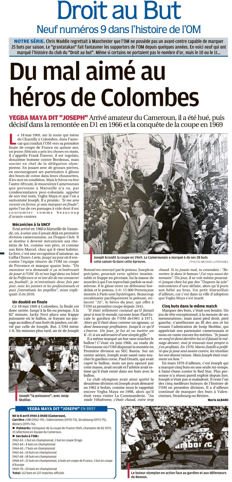 Joseph, le colosse au coeur tendre Joseph Yegba-Maya, dit Joseph, a longtemps fait les beaux jours de l'Olympique de Marseille dans les années 60 avant de finir sa carrière de joueur à l'AS Béziers. Entraîneur de nombreux clubs du biterrois, le Camerounais a définitivement raccroché l'an dernier aux Cheminots à 64 ans. Maya, le nom résonne bien. Ne cherchez pas l'abeille, c'est un colosse au regard tendre et la poignée de main chaleureuse qui ouvre la porte de sa villa de Néfies, à une trentaine de kilomètre à l'Est de Béziers. " L'attaquant le plus puissant et le plus percutant du championnat " comme le désignait l'Age Educatif en 1973, a indéniablement gardé quelques souvenirs de carrière. Il nous amène clopin clopant dans son salon. Ses prothèses du genou et de la hanche ne lui ont pourtant pas enlevé son large sourire ou son goût de l'effort. " On se maintient, un peu de vélo, de marche. Tu transpires, c'est le bonheur ! Comme discuter football avec vous ce matin". Maya ouvre allègrement la boîte à souvenir. Sa carte d'identité indique qu'il est né à Otélé à quelques kilomètres de Yaoundé, la capitale du Cameroun. " Mais comme notre père était mécanicien aux chemins de fer, il était muté à droite et à gauche ". Ses talents de footballeur, le jeune Joseph les met tout d'abord au service du Dragon Club de Yaoundé en première division puis débarque à Marseillais en 1960 chez son frère aîné, Marcel. " Je voulais devenir mécanicien comme lui mais je ne savais pas où j'allais ". Il joue aussi en banlieue, au Gallia Chutes-Lavie et c'est Mr Pinder qui l'amène à l'OM en 62, car Maya est tout sauf un clown du football. Un jour le Gallia tombe contre la réserve de l'Olympique en coupe de Provence. Joseph met quatre buts mais son équipe perd 5-4 en prolongation. " Après le match les dirigeants de l'OM m'ont demandé si je pouvais passer au stade le lendemain. C'est parti de là ". L'OM le loge dans une chambre de l'Hôtel de la Préfecture " Chez Slim ". Nourri, blanchi, motorisé pour aller aux entraînement. " Ils m'ont dit " ton occupation c'est de jouer au foot Je ne pouvais que progresser dans ces conditions." Il s'entraîne avec les pros le matin puis avec les juniors l'après-midi. Tous les jours il est au stade, entraîneur d'un certain Roland Courbis quand celui-ci était pupille/ minime à l'OM. Car " les pros étaient obligés d'aller faire l'école de foot le mercredi ". Ses soirées, il les passe plutôt à danser à l'AGM lors des soirées étudiantes où il commence à flirter avec Antoinette, sa future femme. Il joue son premier match de D1 à Sedan en novembre 62, défaite 4-0. "Cela m'a marqué car on montait en train, on arrivait cassé en deux et il fallait quand même jouer ! Lens, Forbach, Valenciennes, Sedan... C'était dur à manoeuvrer ces gens du Nord. Il faisait un froid ! Après quand tu jouais au stade Vélodrome c'était cool. Mais si tu jouais mal, tu entendais " Est-ce qu'il y a un bateau dans le port ? Remettez-le dedans ! lâche t-il dans un grand rire. Des tomates, j'en ai reçu, je ne m'en cache pas. Qui n'en a pas reçu au stade vélodrome ?! " Joueur intelligent mais parfois maladroit, il ne peux éviter à l'OM de faire l'ascenseur vers la D2. Certaines défaites comme la déculottée de Lens (8-1) provoquent l'ire des supporters, surtout à Marseille où les mouettes en savent souvent plus sur le football que n'importe où ailleurs, Maya gagne les galons de chèvre quand il ratte des buts. " J'ai eu des hauts et des bas comme Cissé actuellement. Quand tout va bien, l'OM est l'équivalent du Real, mais le méridional a le sang chaud ". Un jour les supporters viennent pour lui casser la maison. Pourtant Maya en a planté des pions, 111 en 202 matchs de championnat avec l'OM ce qui fait de lui le 4e meilleur buteur de l'histoire du club derrière les Skoblar, Anderson et Papin ! " En 70, j'en mets cinq à Saint-Ouen face au Red Star. Combien on est dans l'histoire du championnat de France à avoir réalisé un quintuplé en une seule mi-temps ? " Sur la Cannebière, Joseph se fait tout de même un nom, Zé, comme on appelle tous les Joseph à Marseille. Et c'est lors de la remontée en première Division, au début de l'ère Leclerc en 65/66, qu'avec son ami togolais Fiawoo en attaque, il a commencé à être vraiment aimé par le public de l'Huveaune. Ce petit stade, préféré au Vélodrome pour la proximité du public, situé proche du rond point du Prado où s'élève la statue de David, incarnation de la force et de la colère après sa victoire contre Goliath. Une force toute à l'image d'un Maya taillé en Hercule mais qui n'aurait par contre pas fait de mal à une mouche. Le joueur a un sens du but inné et marque les 3/4 de ses buts grâce à un jeu de tête irrésistible. " Je n'étais pas trop technique et je ne participais pas beaucoup au jeu mais j'anticipais beaucoup dans la surface ". Maya était aussi un remiseur dos tourné au but ou un " plongeur ", celui qui décrochait pour créer des espaces. L'accession en D1 lors de la saison 65/66 se joue en juin contre Bastia. 15000 spectateurs s'entassent derrière les grillages de l'Huveaune, chauffés à blanc, tout autant que les joueurs. Ça tombe comme à Gravelotte. Fiawo met K.O. un adversaire d'un coup de tête avant d'être expulsé alors que Brotons se retrouve avec une fesse brûlée par un pétard. Cela n'empêche pas l'OM de ne faire qu'une bouchée des Corses, avec un but de Maya, obtenant ainsi le droit de rejouer en D1. Les banderoles " Tremble Nantes, L'OM arrive ! " avertissent déjà les doubles champion de France 65 et 66. France Football titre même " Vive Marseille, le futur Naples du football français !". Massilia la sulfureuse, Maya confirme qu'elle l'était aussi au Vélodrome : " Même la piste cyclable était bondée parfois, un monde fou ! Sinon les supporters faisaient le toboggan dessus pour envahir la pelouse ap