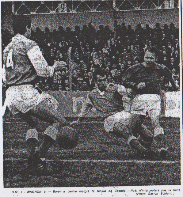 Reprise sur le mode mineur Beaucoup plus repliés que d'habitude les Avignonnais laissaient l'initiative des attaques aux olympiens marseillais qui obtenaient un corner. Trusas était blessé et sur une contre-attaque de Riefa, une ouverture sur Bonnet et Escale devait plonger dans les pieds de l'ailier visiteur. Le jeu était moins vif, mais plus heurté qu'en première mi-temps à ce rythme les Marseillais pouvaient plus facilement imposer leurs attaques. L'O.M. marque Dès lors, Sifferien connaissait une période critique. Sur un centre de Buron puis Ehrard, puis sur deux tirs de Joseph et Brotons dont la reprise passait au-dessus. Mis en confiance, les Marseillais attaquaient encore par Joseph qui déviait sur Hodoul, lequel servait immédiatement Brotons dans le tir croisé prenait Sifferien à contre-pied. L'O.M. acculait Avignon dans son camp. Les visiteurs sortant de leur réserve sous l'impulsion de Siatra et de Baconnier, passé au centre de l'attaque, se livraient à un forcing effréné. Un tir très sec de Bonnet, obligeait Escale à plonger puis Siatra dans la surface de réparation avait une occasion de tirer mais sur un arrêt d'un défenseur marseillais bénéficiant d'un coup franc que Latour mettait à côté. Ainsis 'envoler la dernière chance d'Avignon de ramener un nul du stade de l'Huveaune. Georges IMBERT |