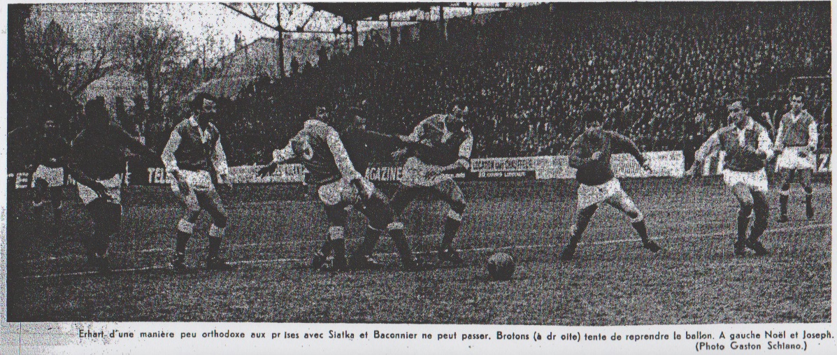 Près de dix mille spectateurs ont dû attendre soixante-treize minutes pour voir marquer l'unique but de ce match que l'Olympique de Marseille et son homologue avignonnais considéraient un peu comme l'épreuve de vérité. À l'instar d'un match de boxe le débat fut engagé sous le signe de la prudence et de l'observation. Richard signa les premières escarmouches, mais Brotons montra le bout de l'oreille. On eut un aperçu de la violence du shot de Bonnet quand Escale fut obligé de mettre en corner, puis il y eut Hatchi, dont le tir passa à côté. Puis Avignon flotta terrible sur les coups de boutoir de Buron et d'Ehrardt. Sifferlen sauvé Sur une de ses attaques, le gardien avignonnais dut subir les tirs des deux ailiers marseillais pour être finalement protégé miraculeusement par la barre transversale. Bonnet, attaquant visiteur le plus incisif, tout de suite après sa chance, mais fauché dans la surface de réparation par Tassonne. Avignon n'en retira qu'un coup franc. Escale fut inquiétée sur une attaque de Riefa mais la reprise de Rigaud trouva le portier marseillais à la parade. Il manquait visiblement à Avignon un buteur pour concrétiser un avantage plus constant en cette première mi-temps : il est vrai que la défense marseillaise ne permettait pas à ses opposants de se placer très souvent en position de tir. À l'O.M., Joseph et surtout Hodoul se trouvaient bien placés pour prendre la défense avignonnaise en défaut. On était en droit de se demander si, contre le cours du jeu, les visiteurs n'allaient pas concéder un but tant leur défense se montrait en certaines occasions hésitantes Une combinaison Hodoul - Brotons confirmait cette impression. Sur une attaque d'Ehrardt, Joseph venait inquiéter Sifferien, mais de côté Escale ne connaissait pas plus de repos et il devait plonger dans les pieds de Riefa qu'un habile travail préparatoire avait placé en position de tir. Une action de Richard échouait encore sur Escale. M. Reynard avait sifflé la mi-temps juste le temps de voir un bolide de bonnet (hors-jeu) et une occasion manquée de Rigaud. |