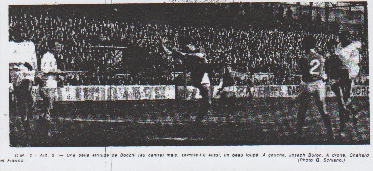 Zatelli : "Les Aixois auraient pu encaisser un but de plus" Dans le camp marseillais, les dirigeants et les joueurs olympiens étaient décontractés. M. Leclerc nous a dit : "Nous voici, à nouveau leader ! Notre victoire avec la défaite de Reims, constitue pour nous, une bonne affaire !" M. Neumann s'est exclamé : "Ce fut réellement dur". L'entraîneur Mario Zatelli constatait : "Les Aixois auraient pu encaisser un but supplémentaire. Certes, la défaite de Bocchi, les a handicapés ! Nos joueurs ont été contractés car ils ont dû attendre jusqu'à la fin pour assurer leur victoire et respirer mieux". Tassone n'était pas content : "J'ai pris un avertissement et pourtant Pin n'a pas arrêté durant la partie de me traiter de tous les noms". Escale en nous montrant son pied, nous a indiqué : "Je souffre de l'orteil et d'un doigt de pied, j'ai une foulure depuis le match d'Alger". Gauthier remarquait : "Deux points de plus ! C'est bien ! Fiawoo, Joseph et Burons, devant ont été excellents". Joseph sourit de toutes ses dents : "Je suis vraiment content d'avoir gagné". Buron s'étonnait : Qu'est-ce qu'ils racontent ces jeunes Aixois ! Ils ont tous la tête enflée, grosse comme une lessiveuse !" Alain DELCROIX |