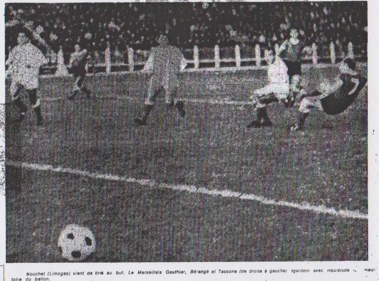 LIMOGES - On n'avait jamais vu ça à Limoges. Ouverte le vendredi, la location atteignait deux millions en quelques heures. Vingt quatre heures plus tard, ce chiffre était doublé et une heure avant le coup d'envoi, les files s'allongeaient interminablement aux guichets. L'enjeu, on le sait, était important, et il s'y ajoutait exceptionnelle douceur d'une magnifique soirée de printemps pour faire de cette rencontre un succès. Les deux équipes s'alignaient dans les formations annoncées. 5e minute, Invernizzi marque... Les premières minutes nous montrent l'équipe locale se ruant littéralement à l'assaut du but marseillais. Dès la première minute, Boucher perce et tire à côté. Puis Yansanne et encore Boucher se montrent très dangereux. À la 5e minute, Invernizzi servi par Nourredine passe irrésistiblement au centre et marque un très joli but. À la 9e minute, ce même Invernizzi décoche de la limite un tir tendu qu'Escale a du mal à dévier en corner. 13e minute : Boucher rate k.o. A la 13e minute Limoges déchaîné rate une occasion unique de réussir le k.o. Barret déborde avec l'aide de Yansanne et arrivé sur Escale, donne à Boucher complètement décalé, absolument seul, à quelques mètres du but. Stupéfaction : Boucher tire à côté ! Stupéfaction : Boucher tire à côté... puis le réussit A la 22e minute, sur une balle longue et nouvelle hésitations de la défense, Invernizzi réussit de la tête à passer à Boucher que personne, évidemment ne pourra rattraper. Cette fois l'ailier droit place calmement la balle à la gauche d'Escale. 25e minute : tête et but de Invernizzi Ce n'était hélas pas fini. Sur un corner concédé par Sejnera et donné par Nourredine, Invernizzi s'élève au-dessus de la mêlée et marque irrésistiblement de la tête, la balle étant déviée par Béranger. |