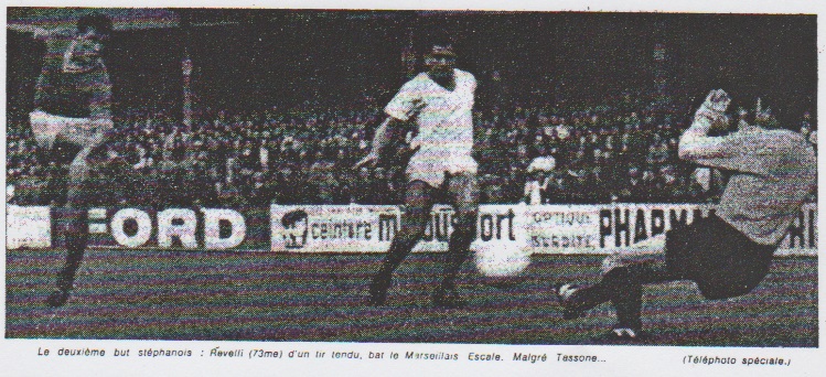 ALORS QUE L'O.M. AVAIT BIEN TENU TOUTE LA PREMIERE MI-TEMPS Deux buts du Gardannais REVELLI Donnent à St ETIENNE une victoire méritée (2-0) (De notre envoyé spécial : Maurice FABREGUETTES) |