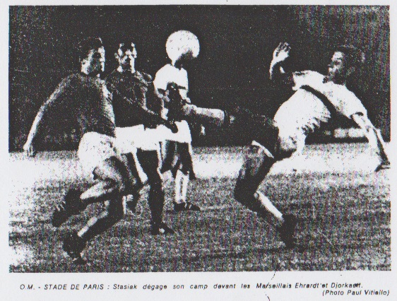 Les supporters de l'O.M. arrivés les premiers au Stade Vélodrome, se sont entraînés en encourageant de la voix et du pied, les treizistes marseillais. Nous écrivons bien du pied, car le nouveau bruit à la dernière mode, est celui fait en tapant en cadence sur des plaques de tôle récemment installée autour de la pelouse. C'est "O.M. tam-tam". Est-ce bon signe ? Marseille XIII vient de gagner, car l'O.M. suivant le Stade, entre sur le terrain. Les deux équipes sont celles annoncées dans la presse. Le public est assez nombreux, mais moins que contre Valenciennes. 10e minute : Rustichelli marque L'O.M. en rouge vif, prend la direction des opérations dès le coup d'envoi. A la troisième minute, Carnus arrête, il est vrai sans peine, un tir de Casolari. Un peu plus tard, centre de Erhardt, tête de Djorkaeff et nouvelle envolée de Carnus, qui se saisit du ballon du bout des doigts. Mais à la 10ème minute, Alba s'échappe sur la gauche et obtient un corner. Corner remarquablement tiré par le même Alba : Rustichelli bondit et d'un terrible coup de tête, catapulte la balle dans la cage d'Escale. Stade 1 - O.M. 0 Un jeu médiocre Après une tentative en force de Joseph, le jeu sombre dans la médiocrité et le public se met à siffler son équipe. Seul, Joseph paraît en état de renverser une situation pour l'instant peu brillante. À la 15ème minute, on le voit, force est en vitesse, passer sur la gauche. Son centre est pour est Erhardt, mais la reprise de ce dernier, trouve Carnus. On constate, fois de plus, que le jeu de l'O.M. manque de précision surtout à partir des lignes arrières et médianes. À la 25ème minute, nouvelle alerte, "la ligne marseillaise" est brisée. Le mulâtre Guillolet arrive seul devant Escale, mais tire sur le gardien olympien, sorti avec beaucoup d'à-propos. L'O.M. attaque enfin A la 35ème minute, c'était au tour du Stade de connaître de chaudes alertes. Une première fois, Carnus surpris, laisse le ballon qui roule pourtant à toute vitesse, rebondit sur le poteau et tout de suite après, il arrête un tir de Casolari. Ce tir et consécutif au premier mouvement de deux joueurs de l'O.M. Pendant ce dernier quart d'heure de la première mi-temps, l'O.M. se porte à l'attaque, mais toujours de manière désordonnée. À la 40ème minute, nouveau tir de "Caso" sur Carnus. On verra de tout au cours de cette mi-temps, le même public siffler l'arbitre de touche, qui surveillait l'attaque du Stade avec une successive sévérité. En fin de mi-temps, un bon centre de Djorkaeff est repris de la tête par "Caso", mais le ballon n'est pas assez frappé pour tromper Carnus. Quelques flambées marseillaises et c'est la mi-temps. Mi-temps 1 à 0 pour le Stade |