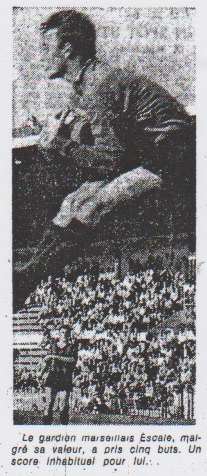 Il arriva à l'O.M. hier, la mésaventure qui lui était advenue la saison dernière à Limoges, en petite condition, les Marseillais furent tout à fait impuissants face à une équipe en état de grâce et qui pratiqua un peu offensif rapide, irrésistible et percutant. Dans le vaste espace vide se situant entre la ligne des arrières marseillais et leurs buts, les courses folles furent toujours à l'avantage des rapides attaquants locaux. Inutile de préciser qu'ils furent les grandes vedettes du match. Le blond Margottin, insaisissable et absolument déchaîné, se joua de ses adversaires grâce à sa vitesse de course et son tranchant. Stievenart, de son côté, aussi rapide et plus puissant ne lui fut pas inférieure. L'un et l'autre signèrent deux buts chacun. Jean-Pierre Dogliani, meilleur technicien que jamais, apporta une note artistique au travail soutenu de Deloffre et Poli. Il est difficile de parler des Marseillais qui ont des excuses à faire valoir. Escale, bien inspiré et courageux, ne méritait pas d'encaisser autant de buts, de même d'Artelesa et Zwunka qui tinrent solidement dans la déroute générale, le centre la défense. Louis DUPIC |
