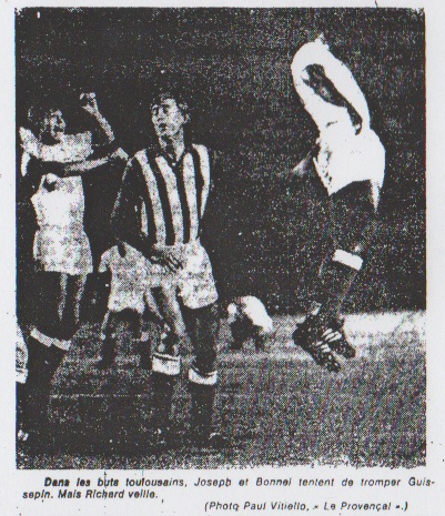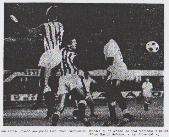 À la 41e minute, Dorsini réussit le premier tir des visiteurs dans sa foulée, mais à côté de la cage. Djorkaeff (45e minute) shoote fort sur Giussepin, qui renvoie mal. À la mi-temps donc l'O.M. mène devant Toulouse par 1 but à 0. En deuxième mi-temps le F.C. Toulouse redémarre avec 10 joueurs seulement, Le Donche étant demeuré aux vestiaires. Le jeu est toujours d'un niveau technique assez médiocre et l'intérêt laisse à désirer. Sur une montée d'Erhardt (50e minute), Djorkaeff reçoit une balle en retrait et décoche un méchant tir sur Giussepin qui plonge et arrête la balle sur la poitrine. Sur un 7e corner olympien Bonnel reprend le cuir de la tête, Giussepin paraît battu mais Redin supplée et repousse la balle du genou. À la 56e minute, Louis Bonnel donne une balle en or à Joseph, qui réalise un véritable exploit : avec beaucoup de sang-froid il feinte Richard, un deuxième défenseur toulousain, passe le gardien Giussepin pour glisser enfin la balle à l'intérieur de la cage vide. O.M. 2 - Toulouse 0. La cause paraissait entendue avec deux buts d'avance, l'O.M. qui a de plus à l'avantage numérique, ne semble pas devoir être remonté. Joseph affole encore la défense de la cité des violettes (58e minute). Puis c'est un tir sur l'extérieur de la cage par Buron (59e minute), Jules Zwunka, déchaîné, monte à l'assaut mais son tir est imprécis. Sur la contre-attaque, Dorsini, Faure (60e minute) tire et Escale stoppe le ras de terre en plongeant. À la 62e minute, Buron s'échappe, centre, Louis Bonnel reprend, glisse, tire faiblement. Bruneton sort la balle sur la ligne in extremis. Le troisième but n'était pas loin. À la 70e minute, Joseph fonce, tire sur Giussepin. La tension s'est nettement relâchée, malgré les encouragements du public. Les uns et les autres ont l'air d'admettre ou de se contenter du score. Destrumelle tente sa chance à la 80e minute, puis c'est au tour de Lopez (81e minute), de Djorkaeff, sur coup franc (84e minute). Toulouse réagit un peu et obtient deux corners, mais l'arbitre siffla la fin sur le score de 2 à 0 en faveur de l'O.M., après un dernier tir de Joseph. |