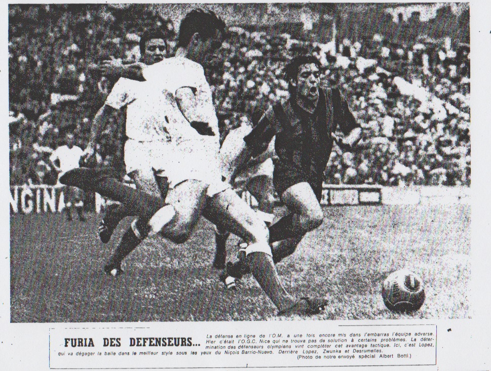 L'O.M. joua une bonne première mi-temps, baissa de pied en seconde, eut de bonnes réactions et finit difficilement. À 10 minutes de la fin, Loubet partit en flèche. Nous avons dit que la défense en ligne de l'O.M. posa aux niçois un problème insoluble pour leurs moyens limités. Tassone livra à Loubet un duel spectaculaire, cependant qu'Artelesa était toujours là où sa présence était indispensable. Zwunka, en première mi-temps, Lopez en fin de partie, eurent l'infortune d'être touchés, heureusement sans gravité. Derrière sa ligne, Escale joua un match remarquable sauvant bon nombre de situations critiques, sortant à bon escient et ne commettant aucune faute. Djorkaeff - Destrumelle, Erhard et Buron jouèrent une partie très méritoire mais le danger pour les Niçois vint presque toujours des deux compères africains Joseph et Fiawoo, qui ne se peuvent décidément pas se passer l'un de l'autre. Devant eux, Serrus, Isnard et Segarra qui ne manquent ni de jeu ni de vigueur, sont constamment en difficulté et eurent des sueurs froides chaque fois que les deux diables noirs recevaient la balle dans de bonnes conditions. À Nice, l'équipe, à défaut d'imagination, ne manque pas d'ardeur, nous avons surtout remarqué un Aubour irréprochable, tout comme Escale. Provins et Rodzik se tirèrent fort bien d'affaire. Le jeu de Jouve, transfuge des Caillols, sans réaliser de miracle, confirma qui était bien un espoir. Loubet grâce à sa vitesse, et Giner, pour son travail opiniâtre et sa sûreté technique, méritent la mention en attaque. Mais combien sont irritants les Argentins Santos et Barrio-nuevo, les bras levés sans cesse, jouant les redresseurs de torts, alors que leur action sont presque toujours à la limite de la régularité. Ne terminons pas sans préciser que le public niçois n'apprécia nullement le système de jeu pratiqué par l'O.M., le jugeant anti-spectaculaire et exprimant bruyamment sa façon de penser. |