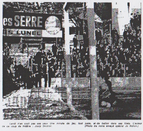 Le régulier Jules Zwunka se rendit coupable en une heure de plus d'erreurs qu'au cours de tous les matches aller. Il y a des jours comme cela, ou rien ne va. Artelesa, Lopez parèrent au plus pressé. Djorkaeff et Destrumelle voyaient sans cesse refluer la balle et étaient plus souvent en défense qu'en attaque. Tassone fut le plus net des arrières marseillais et Jean-Paul Escale, heureusement parfait. Il se montra aussi bon sur les rares tirs gardois que sur les nombreuses poussées adverses. Il ne commit aucune faute et joua le meilleur match de la saison. Malheureusement pour le spectacle, la tenue des Nîmois, exemplaire sur le plan de la volonté, de l'engagement physique était bien loin de faire oublier les carences marseillaises. Comme leurs visiteurs, les Crocodiles accumulèrent les mauvaises passes et les maladresses devant le but. À cet égard, Gomez, Chillan et le malheureux Brésilien Francisco furent de grands coupables, et aussi l'ami Guy Hatchi, ce qui est plus surprenant. Garnier, Rouvier, Novi se battirent courageusement, et Kabile livra un duel spectaculaire à Casolari et Skoblar. Landl est impossible à juger pour la bonne raison qu'il n'eut pratiquement rien à faire. Les meilleurs nîmois furent Charles Alfred, impressionnante de santé et d'autorité et Marcellin. Nous ne comprendrons jamais comment Nîmes a pu se passer des services du populaire Charlot qui finit par décourager Skoblar et se tenir en pointe. Marcellin souffrit de la comparaison avec le Yougoslave. Il n'en fit pas moins d'excellentes choses... dont ses camarades ne surent jamais profiter. Ces deux grands techniciens furent aussi les grands incompris de ce derby finalement décevant. |