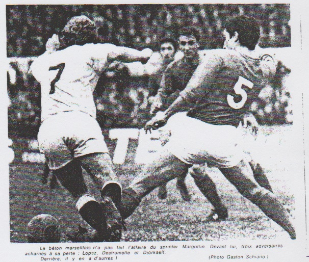 Un festival de dribbles... et, en guise de conclusion, un excellent tir qui faillit tromper le vigilante Escale. Angers allait-il marquer le premier ? On le crut, quand Margottin, s'étant aidé de la main, se trouva seul devant Escale. Mais le blondinet angevin croisa trop son tir. Puis Skoblar, bénéficiant d'une balle contrer entre Erhardt et Chlosta, tira sans plus attendre. Une balle à effet qui glissa sur la transversale après avoir été effleuré par Gallina. On le voit, la partie était très vivante fort disputée et assez équilibrée. SKOBLAR sur penalty C'est à la 42e minute que se produisit un incident qui allait avoir une grande influence sur le résultat. Skoblar, en position de tir, en pleine surface de réparation fut poussé dans le dos par Mouilleron. Penalty ! Skoblar, cette fois ne laissa aucune chance à Gallina. O.M. 1 - Angers 0. Juste avant la pause, Dogliani tenta le grand chelem tout seul. Il passa la défense de l'O.M., en slalom avant d'être contré in extremis par son ami Escale. Bravo Jean Pierre et bravo Jean-Paul ! POLI égalise La deuxième mi-temps mérite un moins long développement. L'O.M. fatigué par ses généreux efforts de la première mi-temps - une équipe faisant courir le ballon comme Angers éprouve son adversaire - subit, de bout en bout, le jeu angevin. L'inévitable se produisit à la 60e minute. Admirablement servi par Dogliani, Poli égalisa presque à bout portant. O.M. : 1 - Angers : 1. La fin de la partie fut difficile à supporter, pour l'amour-propre des spectateurs olympiens. À quelques rarissimes contre-attaques près - Skoblar trop seul à la pointe du combat - il n'y eut qu'une équipe sur le terrain. Mais enfin, de bric et de broc, à force de volonté et au prix d'efforts désordonnés mais louables, O.M. réussit à conserver le point du match nul. Un point précieux et en définitive, pas tellement immérité. Maurice FABREGUETTES |