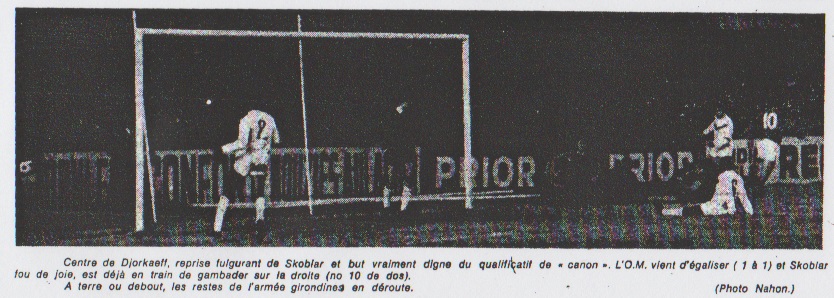 SKOBLALR était là, ce dont nous n'avions, personnellement, pas douté. Arrivé dans la soirée de la veille après avoir raté le départ de l'avion à Belgrade, souriant et intact. Les équipes se présentaient donc de cette façon devant 15.000 spectateurs environ. O.M. : Escale, Tassone, Artelesa, Zwunka, Lopez, Djorkaeff, Hodoul, Destrumelle, Casolari. BORDEAUX : Montes, Moevi, Chorda, Calleja, Rey, Abossolo, Keita, Guillas, Ruiter, Texier, Couecou. La partie ne comportait pas de période d'observation et dès les premières secondes Couecou et Texier se montraient menaçant avec qu'un contre invraisemblable ne mette Moevi en mesure de marquer. Au célèbre style "réaliste" des Girondins, O.M. répondait par un jeu aérien et décousu qu'il a adopté depuis le désastre de Rouen et ne lui réussit pas trop mal, si on considère le résultat. C'est ainsi qu'un extraordinaire centre à effet de Skoblar arriva à la 14me minute sur la tête de Djorkaeff qui mettait de peu à côté. Nouveau service de Josip vers Casolari, rejoint près du but par Moevi (17me minute). 20me minute : Ruiter marque Les Girondins allaient ouvrir la marque sur une charge pied en avant de Texier, tout à fait répréhensible, prolongée vers Escale par un coup de tête trop faible de Lopez et une pichenette de l'opportuniste Ruiter. Le Brésilien, sévèrement marqué par Artelesa, touchait la balle pour la première fois, mais c'était la bonne. Couecou, à la 26e minute était à deux doigts de creuser l'écart, mais placer la balle à côté, après avoir trompé Escale. 28me minute : Skoblar égalise Tout au contraire, Skoblar signait son douzième but marseillais en reprenant de façon foudroyante au point de penalty une bonne passe latérale de Djorkaeff... Un but classique applaudi comme il convenait. Après cette action magnifique, le jeu baissait de plusieurs tons. |