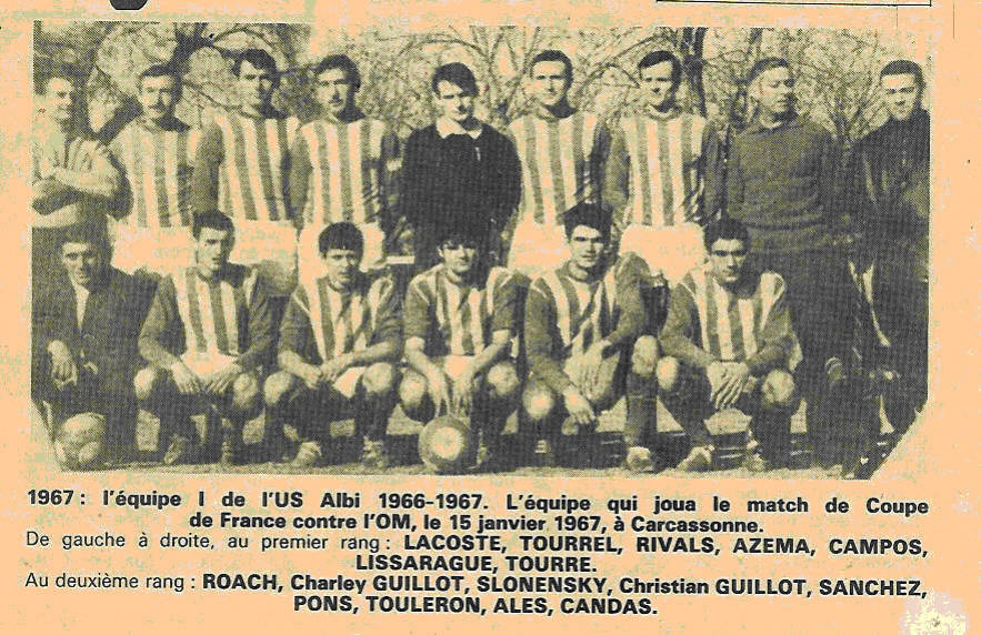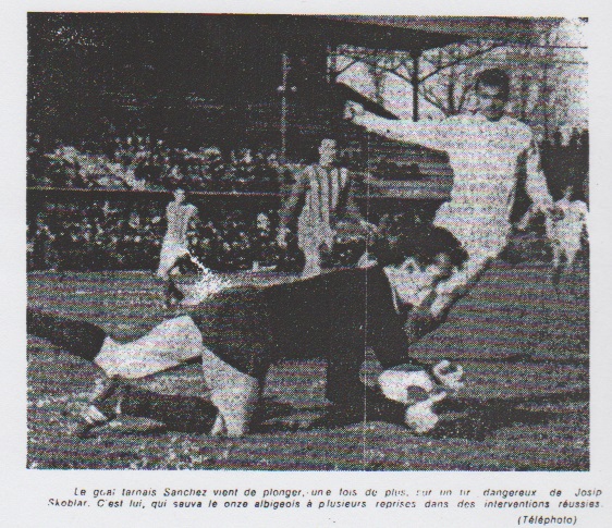 Peu après, alors que l'on m'approchait de la fin de la première prolongation, ce fut le coup de théâtre ! L'une des rares contre-attaques tarnaises se développait. L'avant-centre Rivals tentait sa chance et Azéma, l'homme qui avait déjà éliminé Montpellier, la touchait légèrement au passage, prenant complètement le malheureux Escale à contre-pied ! On en était à la 104me minute du match. Les rares Albigeois présents s'embrassaient de joie. Le public local n'en croyait pas ses yeux et les Marseillais étaient catastrophés. Le temps de rire ou de pleurer, en tous cas de commenter l'événement et les deux équipes changeaient de camp pour la dernière fois. Les Marseillais qui n'avaient pu marquer le moindre but en 115 minutes allaient égaliser tout aussitôt. Et c'était à Skoblar, l'homme qui vaut un but par match, qu'allait revenir l'honneur de ce sauvetage. Il fonça dans son style à la fois élégant et puissant, et l'expédia la balle au fond. Il restait treize minutes à jouer qui ne changèrent rien à l'affaire. Les Tarnais défendirent âprement leur match nul et l'O.M. qui revenait, en l'a compris, de loin, ne put arracher la victoire malgré de nombreuses tentatives... On comprend qu'il soit difficile de tresser des couronnes aux joueurs de l'O.M., qui eurent le seul mérite de ne pas se décourager et de réagir lorsque Azéma eut ouvert le score. Il faut tout de même citer Skoblar, qui réussit là où les autres avaient échoué. Albi, entendu, il faut louer la défense en bloc, et en particulier le gardien Sanchez, les frères Guillot, Slonenski et l'opportuniste Azéma. |