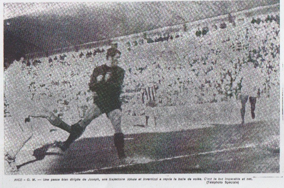 Les Niçois réagissaient automatiquement et à la 41me minute, Loubet ouvrait excellemment sur Serra en position d'avant-centre. L'ailier gauche niçois égalisait, mais il était parti légèrement hors-jeu et l'arbitre refusé très justement ce but. Un penalty imaginaire Dès la reprise et avec l'aide du vent, les Niçois dominaient à leur tour. Dès la 42me minute, Escale arrêtait somme toute facilement, un bon essai de Santos. La défense marseillaise était cependant aux abois à la 52me minute, Loubet réussissait à feinter fort justement Zwunka son garde du corps, sur l'aile gauche. Son centre a priori inoffensif, trouvait Tassone à la réception, dans la surface de réparation. C'est alors que l'arrière droit marseillais victime d'un mauvais rebond, touchait malheureusement la balle de la main et provoquer une division ahurissante de M. Rios. En effet, l'arbitre accordé le penalty et Santos égalisait pour Nice, à la 52me minute. Par la suite, le jeu se cantonnait au milieu du terrain, les défenses prenant régulièrement le meilleur sur les attaques. Pourtant, sur une hésitation de l'Isnard, Invernizzi récupérait le ballon dans les 18 mètres niçois, mais Aubour le contrait astucieusement (75me minute). Enfin, à la 79me minute, sur une passe en cloche de Serra, Loubet trouvait suffisamment de chance pour s'échapper, mais il tirait à côté de la cage d'Escale. Pour les gardiens de but c'était la dernière alerte sérieuse d'un match qui se terminait avec beaucoup moins de passion qu'il n'avait commencée. Désiré CARRE |
