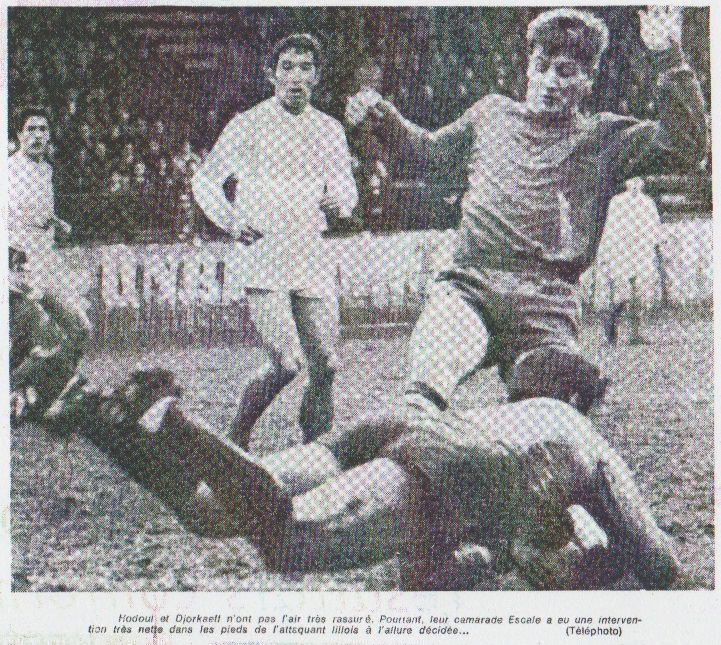 LILLE - Contrairement à ce qui avait été annoncé à Marseille, le coup d'envoi est sifflé à 15 h 30. Le gris très foncé du ciel laisse supposer que l'on finira à la lumière électrique. Bien que la pluie ne soit que fine et intermittente, la pelouse est extrêmement grasse, donc lourde et fatigante. En première mi-temps, les 22 joueurs ont beaucoup couru, faisant la preuve d'une condition physique et d'un esprit de corps exemplaire pour un résultat dérisoire. Disons pour user d'une vieille formule, que les défenses renforcées de part et d'autre ont pris nettement le pas sur les attaques éparpillées et toujours inférieures en nombre. Jusqu'à la 38me minute, le gardien lillois Samoy ne toucha pratiquement pas le ballon. Mais si Lille domina durant toute cette longue première période, Escale fut surtout menacé par ses partenaires. À la 3me minute, il dévia en corner une balle mal dégagée par Zwunka. À la 25me minute, sur une passe en retrait très mal venue d'Hodoul, il fut blessé par Houen. Pour le reste, les manoeuvres trop lentes de l'équipe lilloise facilitèrent le regroupement des défenseurs olympiens autour de leur "couvreur" Artelesa. Les cinq minutes de l'O.M. A la 38me minute devait commencer ce que nous appellerons la grande période de l'O.M. Très courte mais dense. Elle débuta de façon curieuse, Joseph profitant de plusieurs erreurs consécutives de ses adversaires directs, partit seul en direction de Samoy. Il ne put ajuster suffisamment son tir et le gardien lillois, du pied, repoussa le ballon en corner. Ce corner, fort bien tiré par Gueniche, donna lieu à quelque mètre du but lillois à une mêlée digne de France-Irlande. Le ballon difficilement dégagé par les défenseurs de Lille, fut aussi repris et centré par Destrumelle en direction de Joseph. Ce dernier fut contré par Samoy et Adamczyk. Le ballon sous l'effet conjugué de ces trois joueurs de poids, glissa vers la gauche ou se trouvait Gueniche, lequel tira directement du gauche. But ? Non ! L'arrière Guimbault le barbu de la rencontre, s'interposa de tout son corps, et ce fut un nouveau corner. Nouveau cafouillage, d'où sortit Novi en bonne position de tir. Mais le jeune demi-olympien n'est pas Puskas, et le ballon, mal frappé, pris la direction des 6 mètres. 0 à 0, donc à la mi-temps. Houen de la tête A la reprise, les Lillois attaquèrent les premiers, Houen ayant esquivé la charge d'Hodoul sur la droite, centra joliment en retrait vers Perrin. Reprise direct et foudroyant de l'avant-centre lillois, le ballon heurtant le poteau droit. |