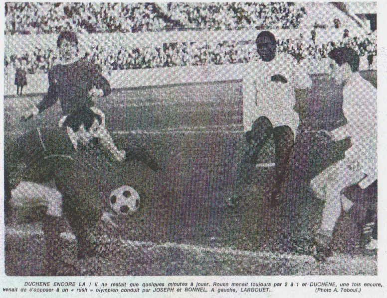 On commentait encore l'événement lorsque les deux équipes (Rouen très applaudi) revinrent des vestiaires. Cinq minutes plus tard, une belle attaque normande se terminait par un tir victorieux du petit Dos Santos ! Là, ça devenait sérieux. Le forcing de Joseph Heureusement pour l'O.M., Rouen, devenu conservateur, se massait en défense et facilitait la tâche de Joseph et de ses camarades, beaucoup plus à l'aise dans le corps à corps. À 50e mn, sur mauvais renvoi de la défense, Joseph fusillait l'infortuné Duchêne pourtant excellent. Un peu plus tard, en bonne position, Joseph ratait son tir. La domination marseillaise devenait massive, totale... Duchêne multipliait les parades, Betta, blessé à la tête et k.o., était remplacé par Godoy à 10 minutes de la fin. Au même moment, un centre de Destrumelle provoquait une bagarre monstre devant le but normand et un but refusé à Joseph pour jeu dangereux. Le temps passé, Sénéchal, épuisé, dégageait une derrière fois en touche et cette touche, à la 92e mn, permettait à l'O.M. de rejoindre son adversaire... L.D. |