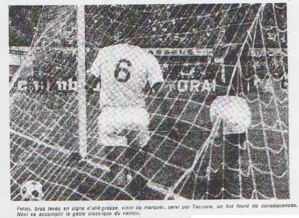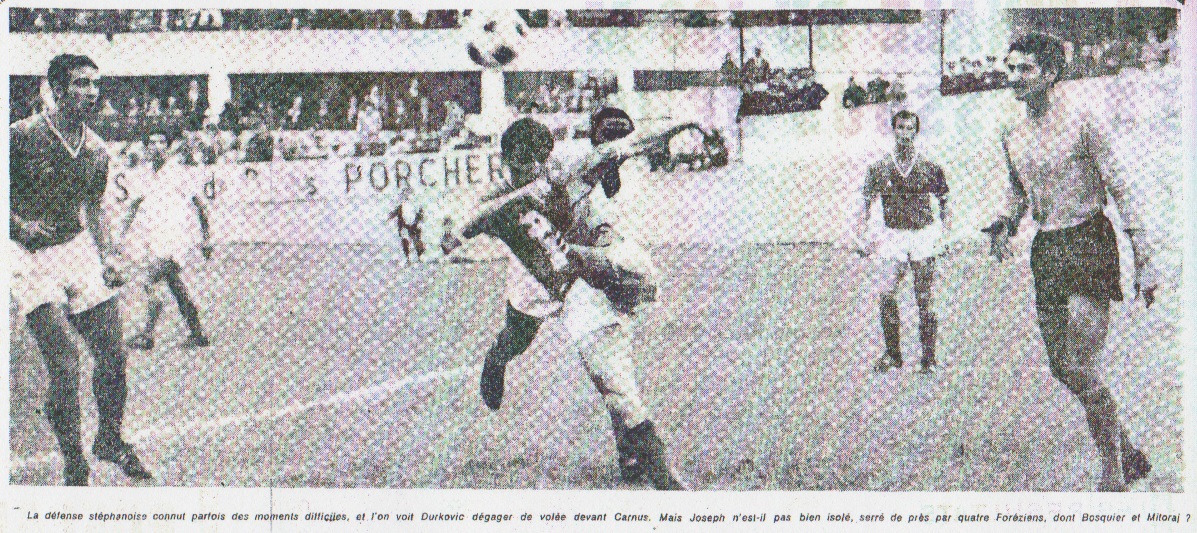 Jusqu'à la pause, les Stéphanois tirèrent habilement parti de leur supériorité technique, faisant courir le ballon... et aussi leurs adversaires... ...et celui de Keita La seconde mi-temps débutait par une vive et courageuse poussée marseillaise qui n'allait d'ailleurs pas se démentir jusqu'au coup de sifflet final, les actions les plus dangereuses trouvant Fiawoo, le plus souvent, à leur origine. Les Stéphanois se défendaient avec bec et ongles et leurs ailiers Fefeu et Bereta n'hésitaient jamais à venir chercher le ballon, aux abords de leur surface ou les Bosquier, Herbin, Mitoraj, pliaient parfois, mais se tiraient toujours finalement d'affaire grâce à leur technique et à leur sang-froid. Grâce aussi, en certaines occasions à M. Mouthon, aux décisions parfois bizarres. Au moment ou Saint-Étienne était le plus dominé, Bereta prenait la balle et la conduisait jusqu'à la ligne médiane, d'où il alertait Keller d'une splendide ouverture. Le Malien laissait tout le monde sur place et marquait imparablement, assassinant à la fois l'O.M... et la dernière demi-heure de jeu... Au cours au cours de ces 30 minutes, les Marseillais ne parvinrent pas à sauver l'honneur - ils le méritaient amplement - malgré une domination écrasante et des tirs à bout portant de Gueniche et Bonnel. Mais Revelli, sur des passes lumineuses de Fefeu et Keita arrivait deux fois seul devant Escale sans pouvoir le battre ! Plusieurs minutes avant la fin, bon nombre de spectateurs cruellement déçus roulaient déjà sur le boulevard Michelet ! Louis DUPIC |
