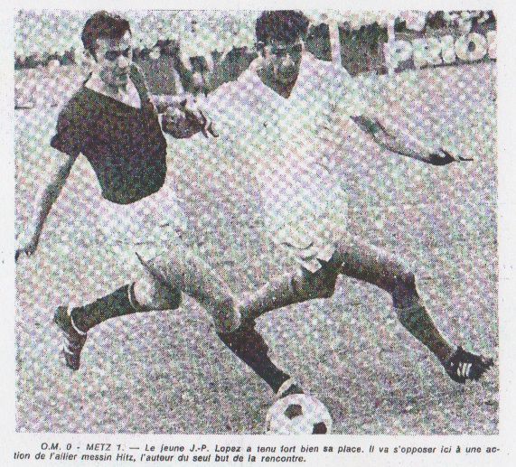 42me : Hitz marque A ce moment-là, Hitz échappa une fois de plus à Destrumelle (qui faisait son possible pour contrer l'un des meilleurs ailiers français) est adressé vers le centre une balle qui traversait de part en part la défense marseillaise, arrivant tout juste dans les pieds de Hitz. Il n'en demandait pas tant et, de quelques centimètres, n'avait qu'à pousser la balle pour provoquer la défaite de l'O.M. Metz réaliste La seconde période nous montra une équipe marseillaise courageuse, mais sans beaucoup de moyens, s'efforçant vainement de vaincre un destin contraire... Mais Metz, compact, solide, bien regroupé en défense devant les excellents Lawnizak et Jeitz, n'était pas un adversaire facile à manier... Certes, Joseph et Fiawoo eurent l'occasion d'égaliser mais ils échouèrent, le premier à deux reprises sur Lawnizak (60ème et 63ème minutes), le second sur le solide Le Chenadec (78ème minute). De leur côté les Lorrains pouvaient alourdir le score par Szepaniak, qui passa de peu à côté à la 75ème minute, sa reprise à bout portant d'une passe de Léonard. Ainsi, sans grand panache, sans brio, mais avec beaucoup de sérieux et de solidité, les Messins firent-ils subir au malheureux O.M., sa quatrième défaite consécutive... Nous serions presque tentés d'écrire... sans forcer leur talent... Mais peut-être n'est-ce là qu'une impression ? Louis DUPIC |