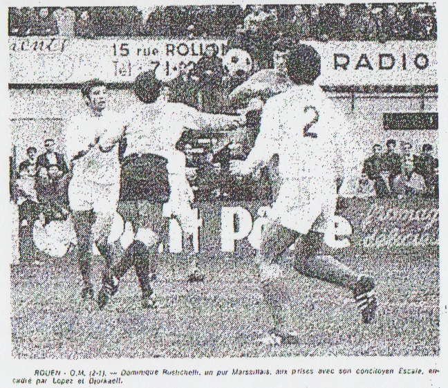 Deux joueurs qui, même dans le cadre d'une équipe anti-collective, sont capables de performances techniques pour l'un, athlétique pour l'autre de première qualité. Bien que pas encore complètement rétabli, Magnusson, quand il a le ballon et même s'il ne le dispute pas, pose des problèmes presque insolubles à ses opposants. La grande classe, ça se voit tout de suite ! Quant à Joseph, c'est "M. Courage" et l'on se demande quel serait le classement de l'équipe si elle ne disposait pas des 80 kilos de muscle toujours en mouvement de son avant-centre à la pointe du combat. Ah ! si Rouen... Et voilà ! Nous avons l'impression de réécrire un article déjà de trop nombreuses fois écrit. L'O.M. c'est une énorme bonne volonté qui, surtout en déplacement, force la sympathie, du tempérament, de la force, mais un désordre et une fébrilité décourageante à la longue. Quels reproches peut-on adresser à des joueurs s'étant battu avec autant de conviction... sinon leur conseiller une cure de désintoxication. Le Football Club de Rouen avec, au départ des petits moyens, à la mesure d'une équipe qui fut pratiquement en faillite la saison dernière, et, lui sur la bonne voie. Celle du jeu offensif, collectif, brillant parfois... Et l'on se demande quel résultat obtiendrait cette équipe si elle avait Magnusson à l'aile droite et Joseph au centre. Un dernier paragraphe pour signaler la bonne forme de notre marseillais Rustichelli et la qualité des Betta, Druda, Largouet et autre Gosselin. |