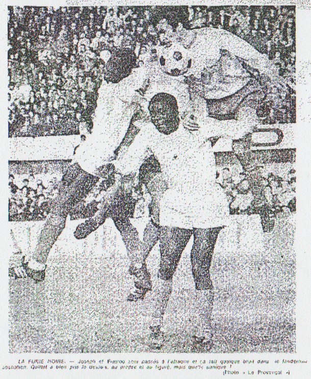 Dans le camp marseillais la joie la plus totale régnait en maîtresse. Joseph était ravi : "Une victoire qu'on ne peut pas contester et moi je repars de l'avant pour le classement des buteurs. Un seul ennui, le coup que j'ai reçu à la cheville et qui m'a handicapé !" Jules Zwunka nous a fait toucher sa jambe enflée : "J'ai reçu un coup à la tête du péroné. Le même coup que devant Ajaccio, mais cette fois-ci je n'ai pas été obligé de sortir du terrain ! Enfin, nous nous sommes rattrapés de l'échec que nous avions subi à Monaco !" Destrumelle n'était pas totalement satisfait : "On ne peut pas jouer de la même manière quand on mène par trois buts que lorsqu'on a qu'une maigre avance ! Votre relâchement en 2me mi-temps est compréhensif !" Roger Magnusson nous a confié très flegmatiquement : "Notre attaque a bien joué ! Tout le monde est en forme ! Je crois que c'est le meilleur match que j'ai fait à Marseille ! |
