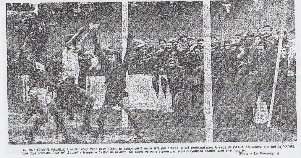 Dans les vestiaires de l'O.M., M. Leclerc était à la fois content et mécontent : " O quel dommage ! Le mauvais temps nous a coûté plusieurs millions. "Par contre, l'équipe est en grande forme, ce qui est très encourageant avant notre difficile déplacement à Angoulême faire. Je crois que, sur un terrain sec, nous aurions marqué deux ou trois buts de plus". Bonnel, le plus entouré, devait nous dire : "Contrairement à ce qu'ont dit les Ajacciens, je n'ai pas marqué le premier but de la main, mais du pied. Peut-être étais-je hors jeu, mais je n'en suis pas sûr". Magnusson : du water-polo Magnusson cherchait un mot pour caractériser ce match. Nous lui avons soufflé "water-polo". Il a souri avant de surenchérir : "la water-polo ! Pas football ça." Faudrait-il croire que l'aimable Roger à des dispositions aussi pour ce sport aquatique ? |
