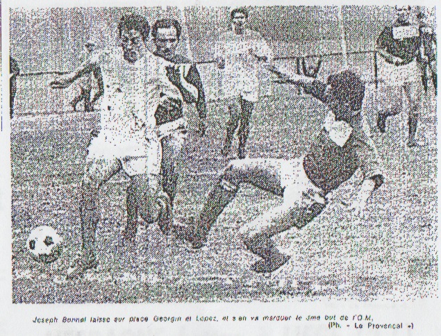 À la mi-temps on pouvait considérer que l'A.C.A avait limité les dégâts. La seconde partie du match, alors que le terrain devenait de plus en plus collant, démarrait lentement. L'entraîneur corse Muro avait fait permuter Moïse et Peretti, sans que son équipe en tire un bénéfice quelconque. Et, alors, Magnusson, longtemps oublié le long de la touche, ce déchaînait. Bonnel par deux fois Il réussissait une extraordinaire série de feintes "promenant" littéralement la moitié de l'équipe corse, et terminant son action par un centre à ras de terre. Fiawoo laissait passer la balle pour Bonnel, qui marquait de près le second but (68e). Cette réussite marquait le début d'un véritable bombardement du but ajaccien ! Iche se distinguait en repoussant coup sur coup des tirs de Fiawoo puis Joseph (70e). Il devait ensuite plonger dans les pieds de Joseph (72e). Enfin, il contrait des tirs successifs de Lopez puis de Joseph. C'est une série de corners qui allait permettre à Joseph Bonnel de signer son "hat-trick". Le coup de coin était donné en retrait par Destrumelle. Bonnel partait comme une flèche, récupérait la balle au milieu d'une défense surprise et allait, tout seul, marquer un très joli but qui déclenchait l'habituelle pluie de coussins et de programmes. Un but qui donnait au score des proportions plus exactes. La seule action insulaire dangereuse se situant à la 80e minute, lorsque Sansonetti se présenta seul devant Escale, auteur d'une très jolie parade. Louis DUPIC |