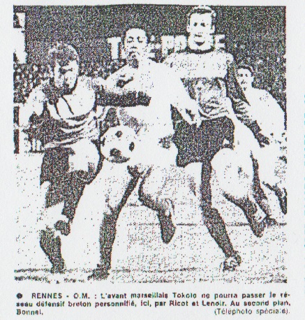 Tout de suite après, voici Joseph seul devant Lefilatre. Un audacieux plongeon du gardien rennais dans les pieds de son puissant adversaire et c'est une deuxième occasion qui s'envole. Une troisième suit aussitôt : Magnusson passe sur la droite comme une lettre à la poste, et tire dans le même mouvement. Bel arrêt du gardien de Rennes. Deux minutes plus tard, bel arrêt aussi d'Escale sur un tir très fort de Lenoir. Comme en première mi-temps donc l'O.M. vient de partir très fort mais hélas sans résultat positif pour le moment. 65e minute, enfin Magnusson On assiste à présent à un net durcissement du jeu, certains joueurs des deux camps commencent à se chercher et parfois même à se trouver, sous l'oeil de l'arbitre trop débonnaire, ce qui n'enlève d'ailleurs rien au fait que l'O.M. a fort bien réagi après les deux buts encaissés, en fin de première mi-temps et qu'il mérité d'être récompensé. Voici qui est fait, juste comme nous l'écrivions ces lignes. À la suite d'une attaque en force de l'O.M., une mêlée furieuse se produit devant le but de Rennes ; en pareil cas, le sang froid prime souvent et c'est donc Magnusson qui, d'une pichenette en sautant aussi pour éviter les coups, réussit à loger la balle dans la cage de Rennes. (65e minute : Rennes 2 - O.M. 1.) Une fin de match volcanique Le dernier quart d'heure est joué à fond de train. L'O.M. sentant le match nul à sa portée, jette toutes ses forces dans la bataille, tandis que Rennes agit de même pour des raisons contraires. Tokoto a le but d'égalisation au bout du pied à la suite d'une fort belle percée de sa part, mais au dernier moment il tergiverse et se fait subtiliser le ballon. Puis c'est Joseph qui, au prix d'une étonnante détente, donne un coup de tête qui aurait presque pu faire mouche. En face, tout ce qui est dangereux passe par Takac et Rodighiero ; c'est alors que se produisit un regrettable accident : cueilli en plein vol par Bonnel, Rodighiero doit sortir du terrain sur une civière ; est remplacé par Garcia (76e minute). Ce qui sans doute n'arrange rien ; les mauvais procédés succèdent aux mauvais procédés. Magnusson est victime d'un croc-en-jambe à son tour. Il se fait justice par un coup franc qui aurait presque pu faire but. C'est alors Zvunka qui est touché à la cheville, les Marseillais répondent, aussi la partie devient excessivement dure et en fin de match c'est miracle que les Rennais n'ajoutent pas un troisième but alors que les réactions de l'O.M., par Joseph et Magnusson sont toujours très fortes. La partie se termine donc sur le score de 2 à 1 en faveur de Rennes, mais on peut dire que cette fois l'O.M. c'est bien battu. |