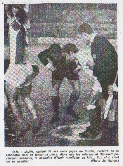 Corner dont et coup de tête de Joseph à côté. Pétards et boites de bière sur la pelouse et appel au service d'ordre par M. Lobelo, toujours magnifique d'allure, et livrant un véritable duel à la fraction turbulente du public placée derrière le gardien de buts Turc. Sur le terrain, les choses se poursuivaient selon le même scénario : tentative vaine de l'O.M. pour prendre la partie en mains, temporisation des visiteurs dont l'ailier gauche Halil, au style fruste, mais à la frappe de balle peu commune, prenait nettement place en défense. Le grand Mehmet sauve A la 60me minute cependant l'excellent Ali était suppléé par le grand Mehmet qui déviait de la tête opportunément un tir de Di Caro. Mais, à la 65me minute, il ne laissait à personne le soin de dévié remarquablement un tir terrible de Tassone. 75me minute : but de Joseph Après une série de sauvetage parfois presque miraculeux, la défense turque s'inclinait sur un débordement de Djorkaeff et une reprise de Joseph. Le dernier quart d'heure ne sera qu'une véritable bataille. 83e minute : Gueniche marque Elle permettra à Gueniche de faire le trou, de dribbler Ali et de mettre les deux équipes à égalité, donnant in extremis à l'O.M. le droit de jouer la prolongation. Au cours de la prolongation, jouée de façon beaucoup moins définitif que les Turcs, Ali déviait encore un tir dangereux de Fiawoo (100me minute) puis stoppait d'un coup de tête de tête de Joseph (108e minute). Donnat remplaçait Destrumelle. Le tirage au sort paressait inévitable. Au terme des 120 minutes la pièce de M. Lo Bello, l'impeccable arbitre de cette dure rencontre, qualifiait les Turcs ! Louis DUPIC |
