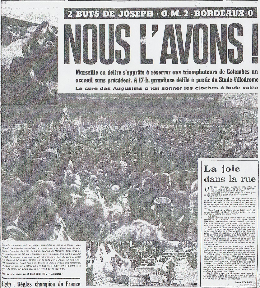 PARIS - Les Girondins de Bordeaux ont encore échoué ! C'est au capitaine de l'Olympique de Marseille, Jean Djorkaeff, ému, mais radieux, que M. Alain Poher, président de la République par intérim, a remis la Coupe de France hier après-midi au stade de Colombes, vers 16 h 40. Lorsque Jean Djorkaeff se retourna pour présenter le précieux trophée, il vit un spectacle inoubliable, fou, démentiel. Les 20.000 supporters marseillais avaient quitté les tribunes et envahi le terrain ou ils donnaient libre cours à leur immense joie. Il y a vingt six ans qu'ils attendaient cet instant ! Les Bordelais, eux, battus 2 à 0, avaient regagné les vestiaires à l'exception de leur capitaine Guy Calleja qui reçu de M. Alain Poher une quinzaine de breloques, la médaille du vaincu. Comme il y a un an, lorsque Bordeaux s'était incliné devant Saint-Étienne (2-1). C'était la sixième fois que Bordeaux échoue en final. L'Olympique de Marseille, lui remporte sa septième Coupe de France. Pour la grande fête du football français le soleil n'avait pas voulu être de la partie. Le temps était gris, maussade, il faisait frisquet, oui, un 18 mai. Il eut même de la pluie, aussi que l'avait annoncé la météo. Ce qui nuisit quelque peu au succès de cette finale. 36.000 spectateurs seulement assistaient à cette rencontre au lieu de 50.000 espérés. Mais 36.000, en majeure partie supporters de l'O.M., menèrent grand tapage dans le vieux stade de Colombes. Ils firent un match crispant, nerveux, qui resta longtemps indécis (Joseph inscrivit les 2 buts victorieux au cours des 8 dernières minutes), mail s'il n'atteignit pas les sommets, il n'en fut pas moins un véritable match de Coupe. La première offensive fut à porter au crédit de l'Olympique de Marseille. À la 3ème minute, Joseph Bonnel servi je Roger Magnusson. Le Dieu blond de l'O.M. prit André Chorda de vitesse et adressa un centre remarquable mais Montes capta la balle dans les pieds de Joseph... Pour bien montrer aux Marseillais qu'ils avaient aussi leur mot à dire, les Girondins répliquèrent immédiatement et Escale fut assez heureux pour détourner en corner une balle que Burdino venait de frapper de la tête (4ème minute). La 52ème finale de la Coupe de France était lancée... Crispés Mais, très vite, l'on se rendit compte que les Bordelais ne jouaient pas avec leur facilité habituelle. Ils étaient nerveux, crispés, beaucoup plus que ne l'étaient les Olympiens. Lorsque Joseph eût raté un but immanquable à la 8ème minute, après une excellente offensive menée par Gueniche et Novi, il y eut quelques mauvais gestes. André Chorda, dans son désir de neutraliser Magnusson, se laissa aller à quelques irrégularités que M. Machin sanctionna alors que les supporters de l'O.M. hurlaient : "Chorda au poteau". Puis vint l'accalmie à la fin du premier quart d'heure. La rencontre manqua de chaleur. Il faut dire que dans les tribunes, nombreux étaient ceux qui regrettaient de ne pas s'être chaudement couverts. L'animation revient à la 24e minute lorsque Chorda, pour deux agressions sur Bonnel et Magnusson, reçu un avertissement mérité. Jusqu'à la fin de la première mi-temps, l'O.M. domina sensiblement mais sans arriver à prendre la défense bordelaise en défaut. Il faut dire que les Girondins ne commettaient aucune erreur, remarquablement groupés autour de leur capitaine Calleja. |