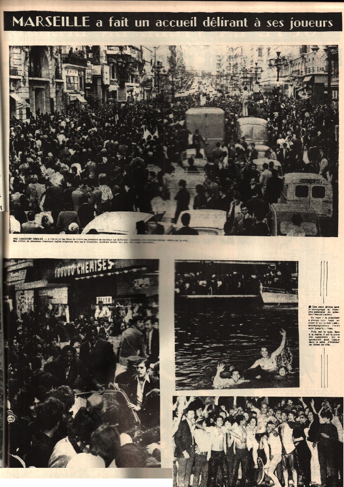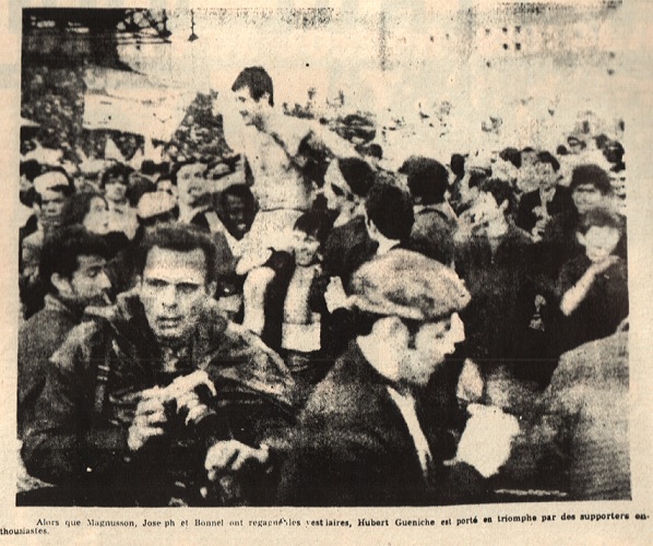 En fait, les Girondins nous ont désormais désagréablement surpris par leur manque d'imagination créatrice. La force collective, la méthode, l'engagement, c'est bien, mais ce n'est pas tout. Tant s'en faut. Le duel Chorda - Magnusson On croyait que le duel Magnusson - Chorda serait la clé du match. M. Machin ne l'a pas voulu, en semblant ignorer presque systématiquement qu'arrêter un adversaire en le tirant par le maillot est une faute caractérisée en football. Dès le début du match sans méchanceté, mais avec une régularité d'horloge, Chorda multiplia les irrégularités. Constatant que M. Machin paraissait n'en avait cure, Roger Magnusson s'énerva, parcouru le terrain en long, en large, pour finalement ne réussir que de ou trois exploits techniques, lesquels n'eurent d'ailleurs aucune influence sur le déroulement de la rencontre et son résultat. On peut donc dire en définitif que ce que l'on a appelé le plan Chorda avait réussi. On ne nous empêchera pas de trouver le procédé inélégant et anti-sportif. Papin en ayant usé de même à l'égard de Gueniche, on finira par croire que Girondins ont pris des leçons de défense chez leurs voisins Béglais. À notre avis, c'est indigne de la grande équipe qu'est tout de même Bordeaux. Quant on est le plus fort, le meilleur en championnat et que l'on compte tant de joueurs de classe dans son équipe ont le prouve balle au pied et non pas en mettant la main sur le maillot. Le tir décisif de Novi En envisageait déjà assister à la prolongation, quand se produisit l'événement imprévisible. Le doigt du destin fut - on excusera la comparaison - le pied de Novi. Nous savons bien que le ballon dans sa trajectoire fut touché par Papin d'abord et Joseph ensuite, rendant impossible la tâche de Montes. Il n'en reste pas moins acquis que l'auteur réel de ce but décisif fut Novi : notre Jacky de Bellegarde. Ce tir miraculeux récompensa justement un coup d'audace et des mois de travail sur le terrain. Ce n'est pas d'hier que le canonnier Novi essaye de perfectionner son tir. Quelle joie pour lui - et quel plaisir pour nous - que ce tir meurtrier ait été réussi en pleine finale, au moment précis où la partie pouvait basculer d'un côté ou de l'autre. La fête ne fait que commencer Le deuxième très joli but, Bonnel - Joseph, ne fut que la conséquence logique du but de Novi. L'équipe menée à la marque se découvre pour égaliser, s'exposant ainsi à une contre-attaque. C'est bien ce qui se produisit. Un "classique" en Coupe en somme. Ainsi donc, à quatre ans de distance, l'O.M. venait de battre Bordeaux en Coupe par le même score, 2 à 0, comme à cette, et exactement dans les mêmes conditions. L'O.M. vient donc de gagner sa septième Coupe, améliorant ainsi son record. Quant à Bordeaux, il a perdu à Colombes sa cinquième finale consécutif. C'est encore un record. Depuis la libération nous avons vu jouer neuf fois Bordeaux en Coupe... et huit fois les Girondins s'inclinèrent. C'est aussi une sorte de record. Mais, pour les Marseillais, joueurs, dirigeants et supporters, la fête ne fait que commencer. On en parlera longtemps, du "choc psychologique" de la saison 68-698... et du but de Novi. |