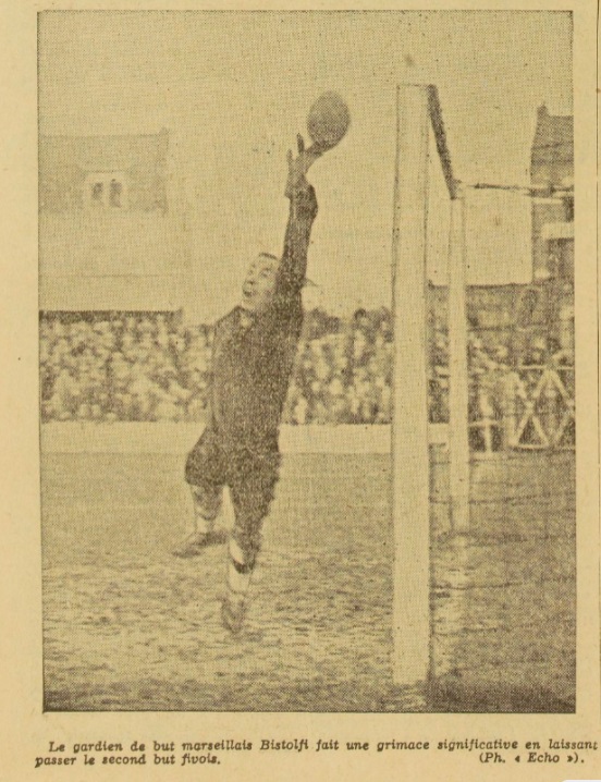 Marseille repart mais vainement et c'est au contraire Fives qui manque de traduire par Lauer. Marseille change la formation de sa ligne d'avants et à la 28e minute Zermani marque un joli but. Fives 3, Marseille 2. A la 38e minute, Waggi égalise sur une mêlée devant les buts fivois. Marseille 3, Fives 3. La minute d'après sur une vigoureuse attaque de Fives, Marseille met en corner qui bien donné permet à Lauer de redonner l'avantage à son club. Fives 4, Marseille 3. Finalement Fives bat Marseille 4 à 3. CONSIDERATIONS Le départ au ralenti des Fivois est imputable aux demis et en particulier à Sefelin qui jouait très en retrait alors que Cheuva s'évertuait à ramener aux avants. Mais la tactique fivoise faiblit en seconde mi-temps et le jeu s'en ressentit. Les meilleurs chez les Fivois furent Cheuva et Guimbard en avants : Gnaoui chez les demis et la défense. Marseille bien parti, ralenti son action par la suite mais ne manqua jamais une occasion. La défense fut faible, sauf Ben Bouali. La robuste ligne de demis fit un bon match et alimenta sans cesse les attaquants qui formèrent la meilleure ligne de l'équipe et desquelles émergèrent Ignace très actif et Sas. |