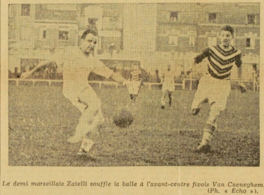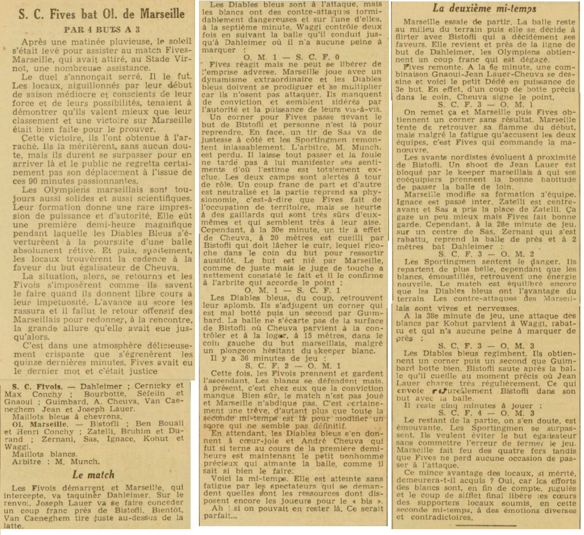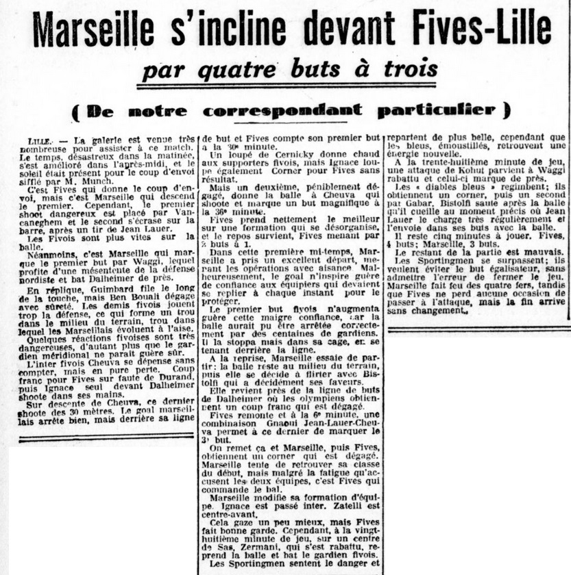 FIVES : 4 MARSEILLE : 3 ____________________ Fives, 25 octobre. Fives est au complet, Marseille a remplacé Gonzales par Henri Conchy. Marseille gagne le toss et s'adapte au soleil. Fives est de suite pressant et Vancaneghem shoote sur le poteau. Mais Marseille s'organise. La défense fivoise s'affole et Wagi ouvre le score à la septième minute. Le jeu rapide des Marseillais déroute Fives qui a peine à s'organiser. Le match est momentanément for agréable. Fives attaque par ses inters et à Marseille c'est Ignace qui se montre sans cesse dangereux. Sur une attaque de Fives, Cheuva shoote des 40 mètres. Le goal marseillais bloque immédiatement la balle et le but est accordé. Fives 1, Marseille 1. Un corner pour Fives est repoussé et c'est au tour de Dalheimer d'être à l'ouvrage. Mais Cheuva s'empare de la balle, descend le terrain et shoote victorieusement à la 40è minute. Fives 2, Marseille 1. Fives est en pleine action maintenant et Guimbard perce à tous coups. Mais la défense marseillaise réussit à se dégager et c'est la mi-temps. A la mi-temps ; Fives 2, Marseille 1. Marseille amorce brillamment mais Ignace sur coup franc contre Sefelin rate la balle devant la cage fivoise. Fives alors se lance vigoureusement à la conquête des buts marseillais. Gnaoui posément manoeuvre avec Jean Lauer qui finalement sert Cheuva en retrait. Celui-ci sans hésiter, shoote vers les buts est la balle pénètre dans la cage exactement contre le poteau. Il y a sept minutes que le jeu est repris et Fives mène par 3 à 1. |