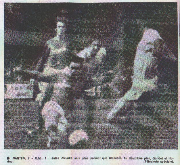 Il est vrai que bien couverte par Hodoul, qui fait ce soir une excellente partie, la défense de l'O.M. ne cède pas de terrain : 0 à 0 à la mi-temps. 47me : Gondet marque Les Nantais allaient être payés de leur générosité dès la reprise. Courtin centre de la gauche en direction de Levavasseur. Ce dernier, après avoir contrôle le ballon et se rendant compte qu'il était mal placé pour tirer, s'avança devant son partenaire Gondet, lequel arrivait au sprint de l'arrière. Le tir en pleine foulée de l'ex-international ne laissa absolument aucune chance à Escale (47e). Nantes 1 - O.M. 0. Déchaîné, Gondet. On le voit aussitôt après, comme aux plus beaux jours de 1966, foncer en plein centre, sauter par-dessus la jambe de Zwunka pour terminer le tout d'un tir percutant. Celui-ci arrêté par un dos olympien. Mais il y a aussi Magnusson - qui a ôté son bandage et semble avoir retrouvé toute sa virtuosité - ce qui lui vaut d'être couché au sol par Lemerre. Le jeu a gagné en intensité ce qu'il a perdu en précision. Des deux côtés on se bat sur toutes les balles le plus souvent en marge de la régularité. Une belle bataille plutôt qu'un beau match. un exploit de Joseph Joseph, lui aussi, allait être payé de tous ses efforts depuis le début de la rencontre, et de son esprit combatif. Mais le but égalisateur de l'O.M. ne lui revient pas en l'exclusivité. Il vient en conclusion d'une action à trois, d'une offensive claire et bien conduite. Bonnel au départ, Loubet dans le rôle de relayeur et un tir du pied gauche de Joseph dans la foulée. Un deuxième but tout aussi inarrêtable que le premier. Nantes 1 - O.M. 1. 68me : au tour de Levavasseur Les choses ne vont pas en rester là bien longtemps. Loubet, qui avait été à l'origine du but de l'O.M., va être curieusement la cause indirecte de celui de Nantes. Replié en défense, il réussit à subtiliser le ballon à Blanchet, mais se trouvant sur la ligne de but il marque une hésitation, le ballon revient à Blanchet, qui centre seul devant Escale. Il y a sûrement une faute de la défense, Levavasseur a le temps de contrôler le ballon et de marquer. Nantes 2 - O.M. 1. Il serait inutile d'ajouter que le public manifeste son contentement de façon extrêmement brillante. À ce moment les deux numéros 12 entrent à la place de Laguillez et Destrumelle à celle de Magnusson. Victoire nantaise Le dernier quart d'heure et tout aussi acharné que ceux que nous avons vu jusqu'à présent. L'O.M. se défend bec et ongles, et Bonnel et Joseph, au centre du terrain, essaient d'égaliser. Mais tout cela ne donne pas grand-chose, et à quelques minutes de la fin, sur une attaque nantaise, le demi Eo, monté en attaque, tire sur le poteau. Le jeu devient de plus en plus dur, mais l'arbitre arrête la partie sur le résultat final de 2 à 1 en faveur de Nantes. |