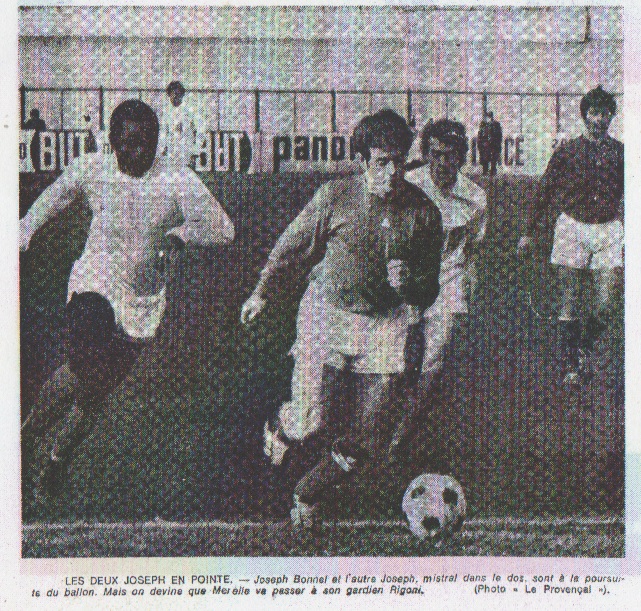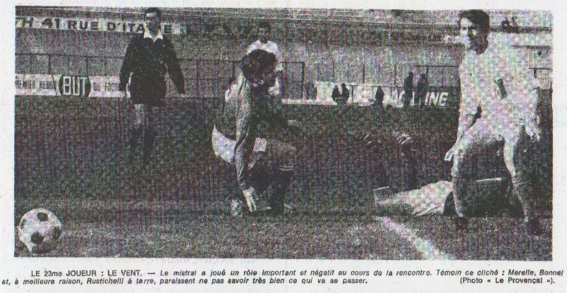 L'entraîneur Gérard ne faisait pas beaucoup de commentaires : "Difficile de jouer avec un tel vent !" Nous n'avons pas été gâtés !" Sénéchal n'était pas content : "Les Marseillais n'ont pas de raison d'être fiers de leur équipe ! Elle n'est pas terrible ! Skoblar n'est pas du tout fair-play ! Les arbitres, à Marseille, n'osent pas faire déplaisir aux joueurs locaux ! J'ai vu l'arbitre, à un moment donné, vouloir infliger un avertissement à un joueur marseillais puis brusquement se dégonfler." M. Leonide nous confiait de son côté : "Ca aurait pu tourner autrement quand Douis a tiré sur la balle pouvant faire mouche". Alain DELCROIX |