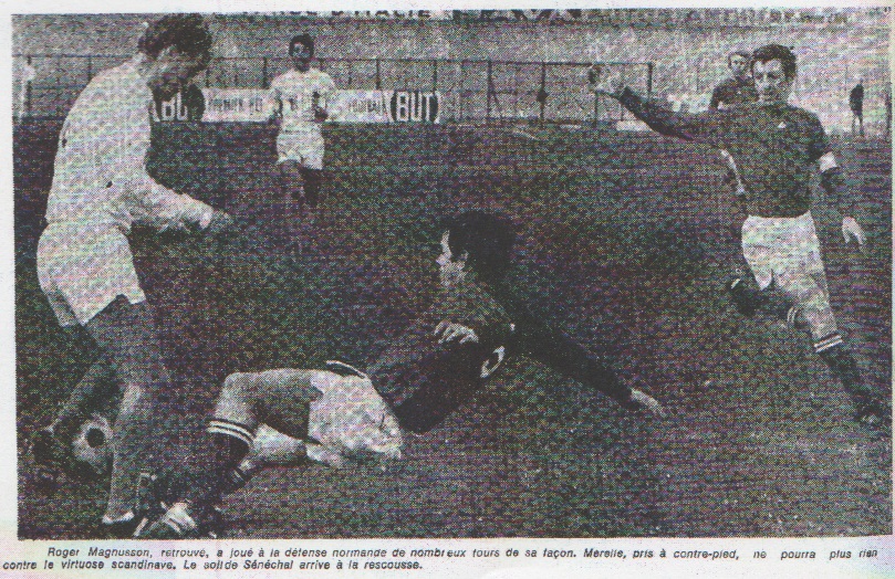 Ainsi, quand l'O.M. obtint un deuxième penalty (51e mn.) pour charge de Senechal sur Bonnel, c'est Magnusson qui fut chargé (avec succès) de son exécution. Quatre penalties pour l'O.M. en deux rencontres consécutives sur son terrain... c'est la bonne moyenne. Sénéchal et Bonnel Nous en arrivons, maintenant, à cette irritante question du jeu dur. Une question qui devrait être mise à l'ordre du jour de toutes les réunions de du syndicat des joueurs "pros". Dans les vestiaires de l'O.M., un seul coupable : cette brute de Sénéchal. Pas très loin de là, chez les Normands, un nom sur toutes les bouches : "ce sauvage de Bonnel !" Laissons Sénéchal à ses basses oeuvres, nous ne le voyons jouer que deux fois par an, mais il est dommage que Bonnel termine une fin de carrière étincelante, par une agressivité stupide et permanente. Si, en première mi-temps, il y avait eu un arbitre de touche digne de ce nom, Bonnel eut été expulsé pour k.o. infligé à Rio, derrière le dos de l'arbitre principal et alors que le ballon était de l'autre bout du terrain. Un grand joueur doit ignorer la vendetta. Magnusson frais et rose Dans l'équipe olympienne, où la défense gênée par une balle capricieuse, joua de manière trop imprécise, nous avons relevé quelques bonnes choses. Skoblar fit une première mi-temps exemplaire. Sa distribution de balle fut assez remarquable. Joseph semble retrouver, après une convalescence plus longue que prévu, sa santé et partant sa force de percussion. Magnusson, frais et rose, toujours aussi spectaculaire et déroutant, pose un problème. Comment pouvait-il être hors d'état de jouer il y a huit jours ? Il y a là un mystère des adducteurs... Loubet se fit siffler par le public. Cependant, il fut, à la fois l'auteur du seul but en mouvement de la partie, et du meilleur tir. Bonnel et c'est là le plus paradoxal, se montra, comme à son habitude, aussi utile qu'indispensable à la bonne tenue de son équipe. À Rouen, Riconi, Sénéchal, Largouet, Dos Santos et le jeune Leroy parurent les meilleures d'un ensemble plutôt sympathique. Maurice FABREGUETTES |