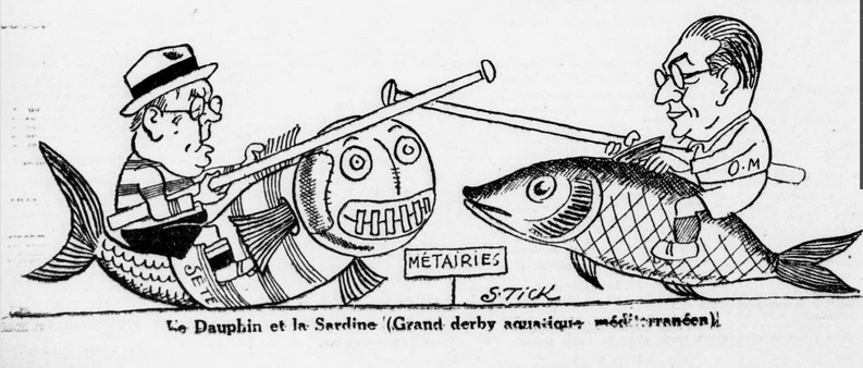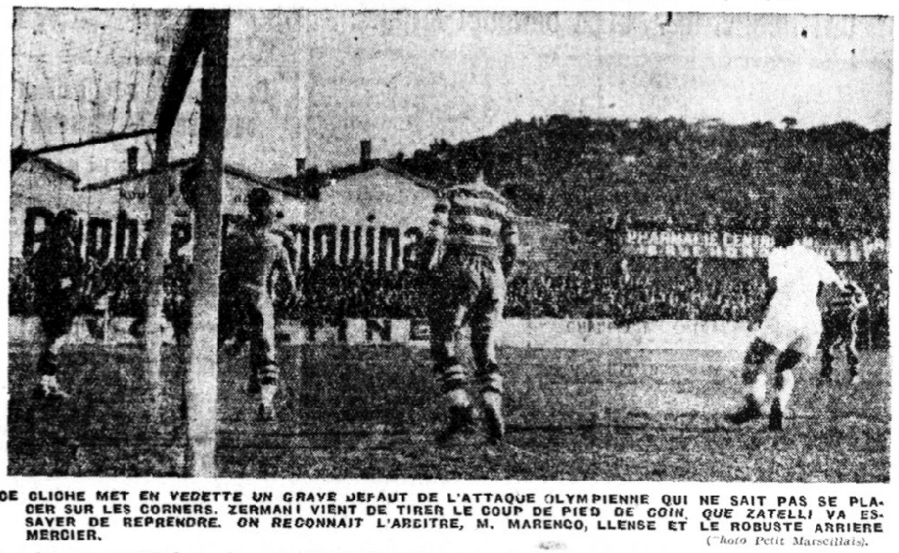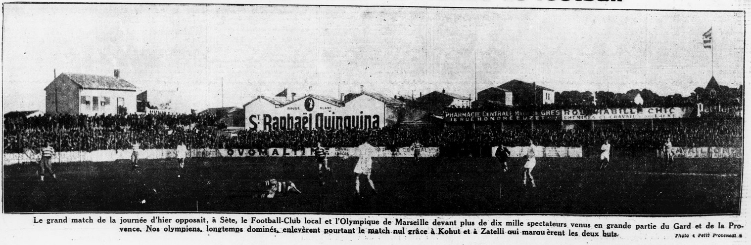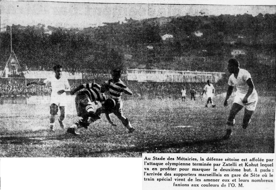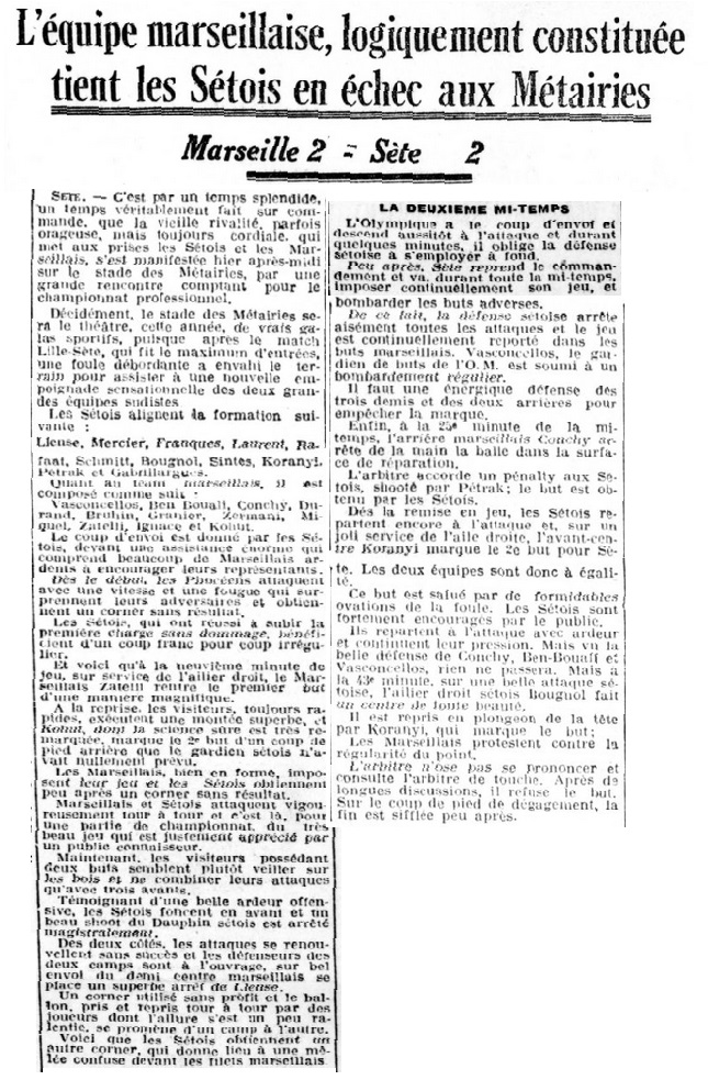 SETE : 2 MARSEILLE : 2 ____________________ Ce fut la même affluence que pour le match Sète-Lille avec une ambiance différente créée par près de mille supporters marseillais venus, comme de juste, encourager leur équipe ce qui promet plus de bruit. Le temps est merveilleux égayé par le soleil avec une petite brise agréable ; le haut-parleur annonce les équipes : Marseille : Vasconcellos, Ben Bouali, Conchy, Granier, Bruhin, Durand, Zermani, Miquel, Zatelli, Ignace, Kohut. Sète : Llense, Franques, Mercier, Schmitt, Rafaat, Laurent, Gabrillargues, Petrak, Korany, Sintes, Bougnol. C'est M. Marenco qui arbitre. Sète engage les hostilités et procède à la première attaque ; Vasconcellos aidé par le vent dégage loin et les avants phocéens partent ; ils se montrent en verve et obtiennent trois corners à dix minutes d'intervalle alors que Sète n'en obtient qu'un. Leur supériorité se concrétise par un premier joli but rentré par Zatelli, à la dixième minute. Le temps de remettre en jeu et sur attaque de toute la ligne, Kohut dernier servi, obtient le deuxième but, véritable but surprise. Quoique bien obtenu, ce début foudroyant semble sidérer les Sétois qui semblent peiner. Enfin, petit à petit, ça vient, mais les Phocéens sentent le danger et serrent en défense, ne laissant que trois avant à l'attaque. Aussi Petrak, Sintes, ont beau faire des étincelles, huit hommes font bonne garde et rien ne passe. Lorsque la balle vient aux avants blancs, ils sont toujours dangereux, mais le jeu revient toujours dans les cinquante mètres de Marseille qui ne s'en laisse pas conter. Néanmoins Vasconcellos stoppe deux ou trois essais dangereux dont l'un lui échappe des mains mais va heureusement en corder. Ignace, blessé aux genoux n'est pour son équipe que d'une aide relative. Bruhin qui surveille simplement Korany à fort à faire mais s'en tire avec quelques horions qui attirent à son équipe des coups francs peu dangereux. Maintenant le jeu est maigre, seul Sète essaye mais se heurte à une équipe décidée et la mi-temps arrive sur le score en faveur de Marseille. |