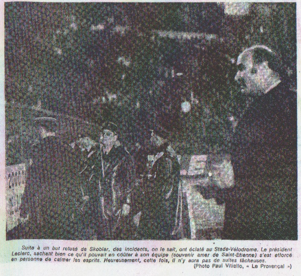 JOSEPH : "LA BALLE ETAIT SUR LA LIGNE !" Tout en jouant un bon match Joseph venait une fois de plus, de tenir le rôle du héros malheureux. "Pourtant, lorsque j'ai marqué sur coup franc en première mi-temps, le juge de touche ne m'avait pas signalé hors-jeu. Et sur le second but refusé, je vous assure que je n'ai repris la balle sur la ligne... Roger peut en témoigner, il était tout juste derrière moi..." Et ce dernier d'acquiescer. VOITURE DE POLICE POUR M. BAUCOURT Il est certain que le froid évita à l'arbitre M. Baucourt, une magnifique bronca. Mais le service d'ordre, qui avait réprimé au cours du match une tentative d'envahissement du terrain, s'il n'eut guère de mal à disperser quelques groupes frigorifiés, jugea utile de l'évacuer dans une voiture de police. JEAN-LOUIS LEONETTI : "AH ! CES MARSEILLAIS" Capitaine d'Angoulême, Jean-Louis Leonetti à retrouver ses concitoyens tels qu'en eux - mêmes. "Ils n'ont pas changé depuis dix ans et ne sont jamais contents ! Pourtant ami Joseph avait repris la balle derrière la ligne. Que pouvait faire l'arbitre ! Et puis, ces Marseillais "pleurent" sans arrêt ! |
