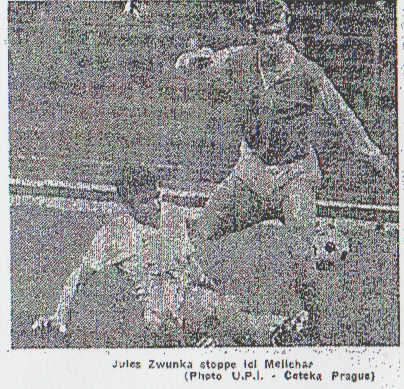 Bonnel en tête Pour en revenir à ce qui se passa sur le terrain de jeu, disons tout de suite que si l'O.M. sortit de la période difficile, il le dut beaucoup à Joseph Bonnel. Il ne cessa tout au long de la première mi-temps de venir au secours de ses camarades, qu'il s'agisse des avants de pointe, incapable de conserver la balle, ou des défenseurs accablés de travail. Il joua hier un de ses meilleurs matches de sa carrière marseillaise et fut l'un des individualités les plus en vue de la rencontre. Avec lui, et il faut citer les gladiateurs Lopez - Zwunka, physiquement égaux des solides Tchèques, bien secondés dans cette tache par Novi et Hodoul. Djorkaeff, capitaine contre capitaine, s'attachant au pas du terrible Strunc. Irrésistible. Merschel, un peu étonné au début, se reprise fort bien par la suite et termina très fort. Magnusson eut en seconde mi-temps quelques débordements dignes de lui. Lopez "fit ce qu'il put" face au meilleur adversaire, le vétéran Dvorak. Joseph, battu par le grand Novak dans le jeu aérien, s'accrocha de toutes ses forces et accomplit quand même sur les coups francs et corners un gros travail défensif. Enfin, on ne saurait trop reprocher à Escale d'avoir encaissé un but dans ces conditions difficiles, avec une balle extrêmement glissante. Dukla un peu décevant. Très mal classé en championnat tchèque, Dukla n'est évidemment plus l'égale de celui de Masopust. Certes il a une solide technique de base, une bonne frappe de balle, une valeur athlétique appréciable et une grande agressivité, et il y a tout de même quelque chose qui ne va pas dans cette équipe. Tout d'abord un rien de lenteur et de raideur qui fait rater les actions amorcées de façon irrésistible, ensuite un manque certain d'inspiration chez des joueurs doués comme les attaquants Strunc, en dehors de son mauvais caractère, Nedorost et Lasso. Nous devons dire que le milieu de terrain est solide, mais pas génial, que Dvorak, 35 ans, le seul rescapé du grand Dukla, et de loin le meilleur défenseur, sans que les autres soient d'ailleurs mauvais. N'oublions pas le trait sûr gardien Viktor, et vous aurez une idée de Dukla, une équipe sans grande faiblesse, mais tout de même à la portée de l'O.M. au Stade-Vélodrome. |
