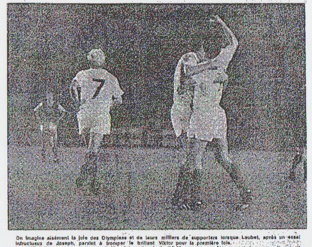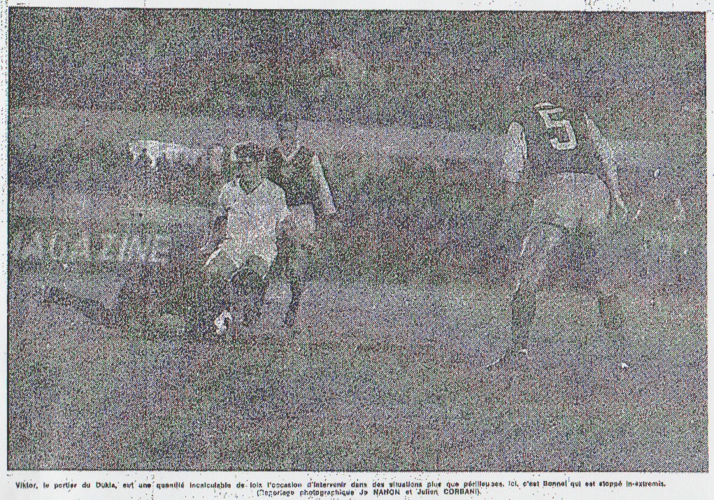 L'étonnant M. Viktor a retardé d'une demi-heure la qualification de l'O.M. Seule la classe et l'autorité du gardien intentionnel tchèque pouvaient empêcher ce que l'on aurait qualifié de "miracle de la transmission des ondes". À un quart d'heure de la fin du temps dit réglementaire, l'O.M., grâce à Loubet, n'avait que rejoint son rude adhèrent adversaire. C'est alors que le haut-parleur annonçait l'étonnante nouvelle : Saint-Étienne éliminait le Bayern de Munich par 3 à 0. "Comment eux et pas nous !", semblèrent penser au même moment les joueurs et le public. Ce fut, pour reprendre une expression à la mode, le choc psychologique, le coup de fouet si vous préférez. Le Planicka moderne. Le stade aussitôt entra en transes, les "Allez l'O.M." se mirent à battre des records de tonitruance et les joueurs se déchaînèrent. Que l'équipe marseillaise n'ait pas marqué un ou deux buts pendant ce dernier quart d'heure et tout à l'honneur de l'extraordinaire gardien tchèque, le Planicka moderne. Parmi tous ses arrêts relatés dans une rubrique voisine, nous en sortirons un : centre de Magnusson, tête de Couécou à bout portant et déviation de Viktor en corner. Il y avait presque de la magie dans cette intervention du gardien tchèque. Nous avions en tout cas, vécu un grand moment de sport. Le grand exploit de Loubet Dès le début des prolongations, un grand exploit offensif de Loubet vint répondre aux exploits défensifs de Viktor. Cette reprise de pleine volée de l'ailier gauche international remettait les choses en place en donnant à la rencontre sa conclusion logique. Sur ce que nous avions vu pendant deux heures d'horloge, la qualification de l'O.M. et archi méritée. Le succès récompensait justement l'équipe qui presque de bout en bout, avait fait le jeu, assumant seule la responsabilité et le risque de l'offensive, mais ce fut dur, très dur comme nous avions pu aisément le prévoir. S'ils n'ont plus le brio technique de leurs aînés, les footballeurs tchèques ne se découragent jamais. A une minute de la fin du match, un tir de Geleta faillit faire mouche, ce qui donnait un avantage définitif à Dukla. À la fin de la prolongation sur corner, on put croire que les mêmes Tchèques, coriaces, allaient obtenir une égalisation inespérée. Oui, un vrai match de Coupe, un match au finish qui passionna son public pendant deux heures. Une victoire collective Malgré ses deux derniers mauvais matches de championnat, nous avions conservé, entière, notre confiance à l'O.M., car nous savions cette sympathique équipe capable de se surpasser dans les grandes occasions. |