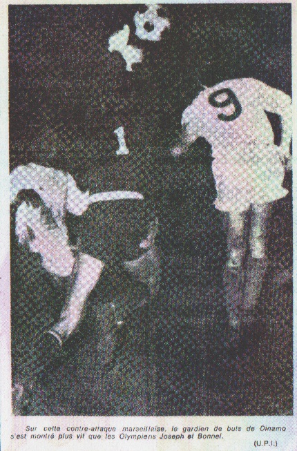 C'était une mauvaise parade de l'Escale (40ème minute). Un peu avant le repos, Zwunka réussissait in extremis à enlever le ballon des pieds de Novak, alors que l'on croyait au but. Il concédait ainsi un 11ème corner. Mais à la mi-temps, Dinamo n'avait toujours pas marqué. La seconde mi-temps reprenait sur le même mode, avec une nette domination des Yougoslaves. Merschel était tout d'abord touchait à la tête, puis nous notions un très bon tir de Belin, bien contrôlé par Escale (50ème minute). Dinamo obtenait trois corners consécutifs, puis c'était le drame ! 52e minute : but de Novak A la 52ème minute, alors que l'O.M. résistait toujours, l'ailier droit Vabek réussissait à mettre devant le but marseillais une balle brossée qui échappée de justesse à Escale, puis était déviée à la désespérée dans les filets par le jeune avant-centre Novak. Nous notions ensuite plusieurs attaques très dangereuses lancées par Dinamo, s'efforçant de faire la décision. Vabec et Ramljak échouaient de justesse. Réaction marseillaise Comme cela arrive souvent, le match basculait à ce moment. Les deux adversaires renonçaient à la guerre de siège et de tranchée pour celle de mouvement. La partie jusqu'alors monotone, faite d'attaques yougoslaves et de renvois marseillais, s'animait enfin. Joseph, sur un centre précis de Merschel, plaçait un coup de tête qui arrivait malencontreusement dans les mains de Dautbegovic (65ème minute). Un moment auparavant, il s'était fait souffler la balle de justesse par l'excellent gardien yougoslave. Dinamo, qui sentait le danger, repartait à l'attaque. Un tir de Piric frôlait le poteau, tout comme, un peu plus tard, un coup franc de Belin (75ème minute). Un autre coup franc tiré de la droite, était repris de la tête à bout portant par Rora ; mais Escale était à nouveau à la parade. Coup sur coup, l'O.M. par deux fois, relevait la tête ; mais Djorkaeff manquait son centre en direction de Joseph, alors que Loubet tirait de volée sur le gardien adverse, toujours bien placée (80ème minute). Nous atteignons la phase finale de cette partie au déroulement tout à fait conforme à nos prévisions : sur un centre de Vabec, Novak tentait et manquait de justesse une reprise de volée un ciseau acrobatique. Joseph, toujours à la pointe du combat, contraignait le gardien a une belle envolée extrêmement spectaculaire. Sur un centre de Lopez, Joseph reprenait de la tête, mais le gardien Dautbegovic était encore à la parade. 89me minute : un 2me but de Novak Alors qu'on croyait la partie finie, l'avant-centre Novak, sur un centre venu de la droite, ajoutait un second but qui accentuait la victoire yougoslave. Louis DUPIC |