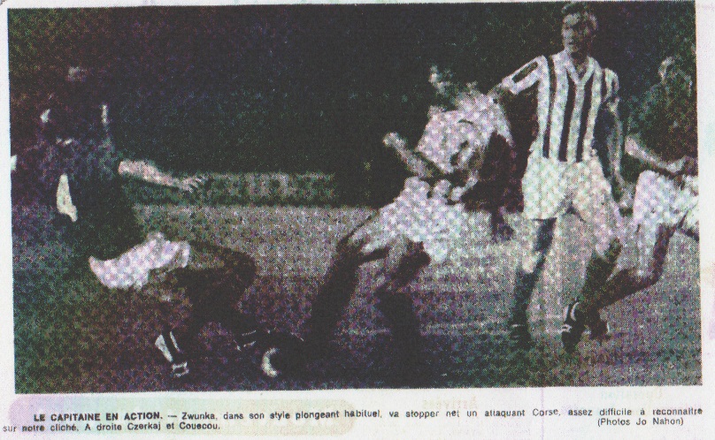 C'est l'ambiance des grands soirs : température douce, ciel sans nuage, foule bon enfant, mais prompte à réagir, parmi laquelle se trouvent, bien sur, de très nombreux supporters insulaires - Ne dit-on pas que Marseille est la première ville corse ? - Eclairage toujours aussi timide - ça s'arrangera bientôt on le sait - et instruments divers qui répondent aux immenses clameurs. Le décor est planté, les acteurs au rendez-vous, l'O.M. reste l'O.M. enfant chéri du public. x x x D'ailleurs, il s'agit bien de retrouvailles entre Marseillais et Ajacciens, certains tels Tassone, Sansonetti ou même Richard étant ici en pays de connaissance. Dédé Tassone, enfant du pays, nous présentait, quelques instants avant le coup d'envoi, un télégramme ainsi libellé : "Soit gentil, laisse passer Charly. Grosses caresses ainsi qu'à ta femme et tes filles. Marraine". Un joli message de Madame Guttmann. x x x De Sansonetti : "Si le championnat s'était arrêté le soir de la première journée nous capitaliserions le maximum points buts etc." Notre ami "Sanso" se pendrait pour Merckx lui aussi terrible capitaliste ? x x x Pour s'échauffer Jules Zwunka arborait un magnifique maillot rayé rouge et bleu. Renseignements pris, il s'agissait de celui de l'équipe de Zadar, la ville natale de Skoblar, où ses parents habitent toujours. Des amis, retour de Yougoslavie, lui en avaient fait cadeau. x x x Louis Hon ne tarit pas d'éloges sur la Corse : "J'ai trouvé là-bas un climat merveilleux, et on se croirait constamment en vacances. Si en outre quelques victoires venaient s'inscrire au tableau, tout serait parfait". x x x Le même entraîneur ne cache pas ses idées sur le championnat actuel. "Je crois disait-il, qu'il y aurait tout intérêt à jouer de mars à octobre. Le temps s'y prête, et les recettes s'en ressentiraient. Voyez ce soir. Une idée à étudier. x x x Un spectateur enthousiaste, à côté de nous, s'adressant à son voisin : "On se lèvera à tous les buts, même à ceux d'Ajaccio ! Les voilà les véritables amateurs de fotball, les purs ! |